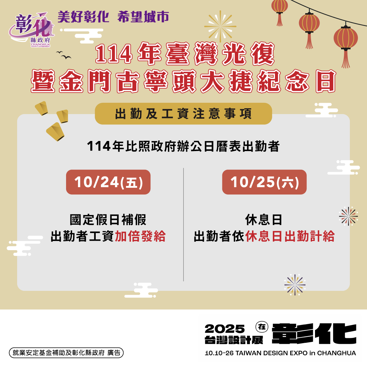 新聞焦點 臺灣光復暨金門古寧頭大捷紀念日為國定假日, 雇主應依法給假並給薪 發布日期 2025/10/14~2025/11/14 | 發佈單位: 勞工處勞動條件科 | 發佈日期: 鄭鼎耀 7532518 | 更新日期 2025/10/14 | 瀏覽人數: 9人 114年10月25日(星期六)臺灣光復暨金門古寧頭大捷紀念日為勞動基準法第37條規定應放假日(即俗稱之國定假日),凡適用勞動基準法之勞工,雇主應依法給假並給薪。雇主若請勞工在國定假日當日上班,依法應加倍發給工資。國定假日如遇到勞工之例假或休息日,應依法令規定另協商擇日補假;如比照政府辦公日曆表出勤者,於10月24日(星期五)為臺灣光復暨金門古寧頭大捷紀念日補假,當日出勤依法應加倍發給工資。 勞工或雇主如有調移該國定假日至其他工作日實施之必要,應透過事先協商,並事先公布調整後的休假且經勞工同意才可實施。 彰化縣政府勞工處進一步說明,國定假日為勞動基準法所保障的勞工權利,雇主若因業務需要,請勞工於國定假日出勤工作,除應徵得勞工同意外,在國定假日上班,或在協商調移後的國定假日出勤,工資應加倍發給。 此外,按日或按時計薪的部分工時勞工,雖工作態樣不一,也同樣享有國定假日出勤工作加倍工資權益。籲請事業單位務必遵守法令規定,照顧勞工休假權益,以免衍生勞資爭議。若有勞動法令相關問題,可洽彰化縣政府勞工處勞動條件科,諮詢電話:04-7532510。