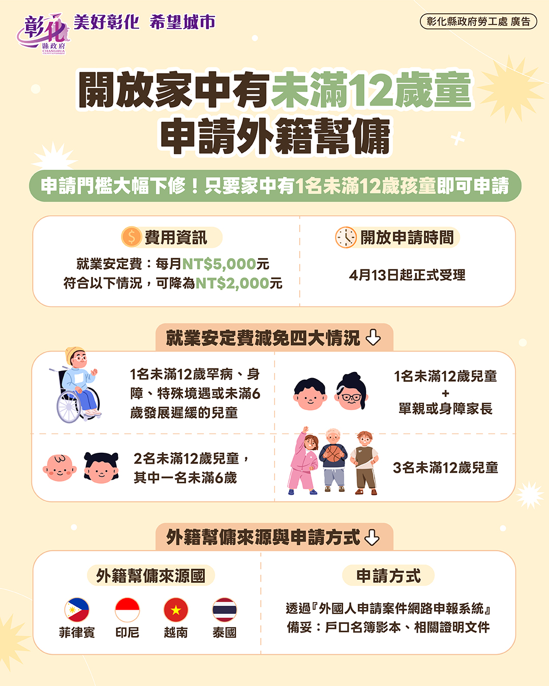 新聞焦點 勞動部新政策上路 家中有未滿12歲孩童可申請外籍幫傭 發布日期 2026/04/10~2026/05/10 | 發佈單位: 勞工處外勞服務科 | 發佈日期: 丁怡珍 7532444分機2444 | 更新日期 2026/04/10 | 瀏覽人數: 79人 勞動部宣布,自4月13日起,凡家中有未滿12歲孩童的家庭,即可申請外籍家庭幫傭。此政策大幅放寬申請門檻,讓更多家庭能獲得照顧支持,縣民可以善用資源,透過「外國人申請案件網路申報系統」,並備妥戶口名簿影本及相關證明文件申辦,以減輕育兒與家務負擔。 根據勞動部規定,家庭只要有1名未滿12歲孩童即可提出申請。每月就業安定費為新台幣5,000元,若符合特殊需求家庭,費用可降至2,000元。減免條件包括:家中有罕病或身障兒童、單親或身障家長、或有多名未滿12歲孩童等四大類。此政策的推行,對於雙薪家庭或育有多名幼童的家長而言,無疑是一大助力。舉例來說,若一個家庭同時有兩名分別為8歲與5歲的孩子,父母皆需全職工作,過去往往必須仰賴祖父母或親友協助照顧,如今能透過申請外籍幫傭,便能有效分擔家務與育兒壓力,讓長輩不再過度勞累,也讓父母能更專心於工作。孩子的生活品質因此獲得提升,家庭整體的照顧資源也更加穩定。 彰化縣政府勞工處指出,這項新政策不僅能協助父母兼顧工作與家庭,也能提升孩童照顧品質,讓更多家庭獲得支持。如有相關問題,除了洽詢勞動部專線1955,亦可查詢外國人權益服務網https://fw.wda.gov.tw/wda-employer/home/index,或洽詢縣府勞工處專線04-7297228。