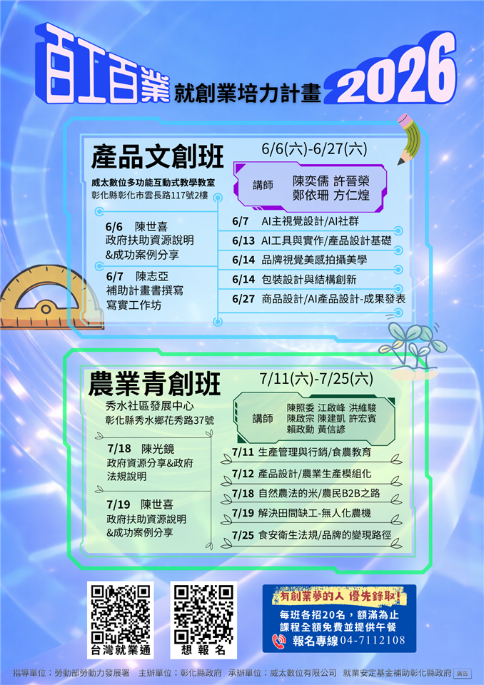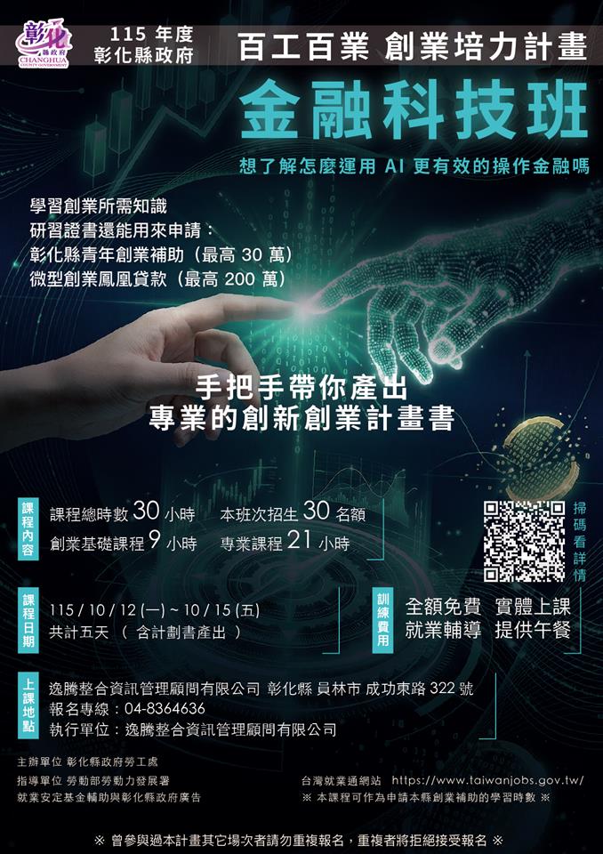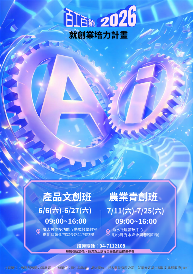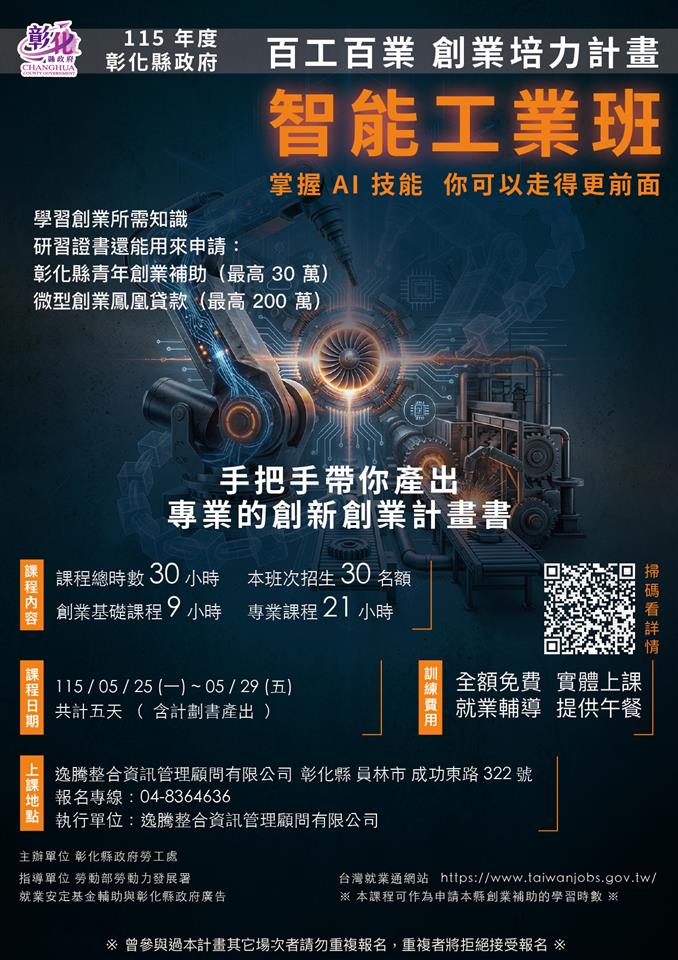 新聞焦點 「創業百工 智匯百業」彰化縣百工百業創業培力課程開跑 發布日期 2026/04/24~2026/05/24 | 發佈單位: 勞工處就業服務科 | 發佈日期: 楊瑞寬 047532412分機2412 | 更新日期 2026/04/24 | 瀏覽人數: 15人 為協助縣內勞工朋友在快速變遷的產業趨勢中站穩腳步,彰化縣政府今(115)年賡續推動「百工百業創業培力課程」,透過系統化的實務教學,提升學員職場競爭力,並帶動在地產業升級,課程將於 5 月起陸續登場,即日起開放報名。 本次課程緊扣市場脈動,規劃4大專業領域:包含產品設計文創班、智能工業班、農業青創班、科技金融班,每門課程包含 9 小時創業基礎課與 21 小時專業課,內容不僅涵蓋專業知能,更導入創業企畫書實戰撰寫。去年產品設計文創班學員初試啼聲即獲補助,在專業老師一對一指導下,將課堂提案轉化為正式申請計畫,最終共有 5 位學員脫穎而出,獲得本縣「工廠產品設計補助計畫」最高 20 萬元獎勵。 歡迎設籍彰化縣,15至45歲之縣民踴躍報名參加,全程免費,每班限額30人,額滿為止。另縣府為協助本縣青年在本地就創業,亦提供青年創業圓夢補助,每人最高補助30萬元,歡迎洽詢本府青年發展處專線04-7121530。