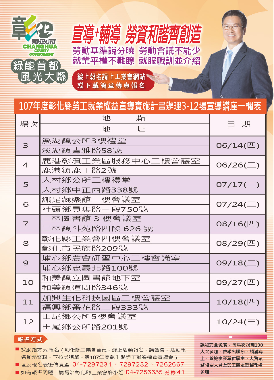 公告資訊 彰化縣政府勞動法令宣導會,30人以上團體或一對一勞動法令宣導輔導資訊 歷史訊息 | 發布日期 2018/06/20~2018/12/20 | 發佈單位: 勞工處勞動條件科 | 發佈日期: 白小姐 04-7532553 | 更新日期 2018/06/20 | 瀏覽人數: 116人