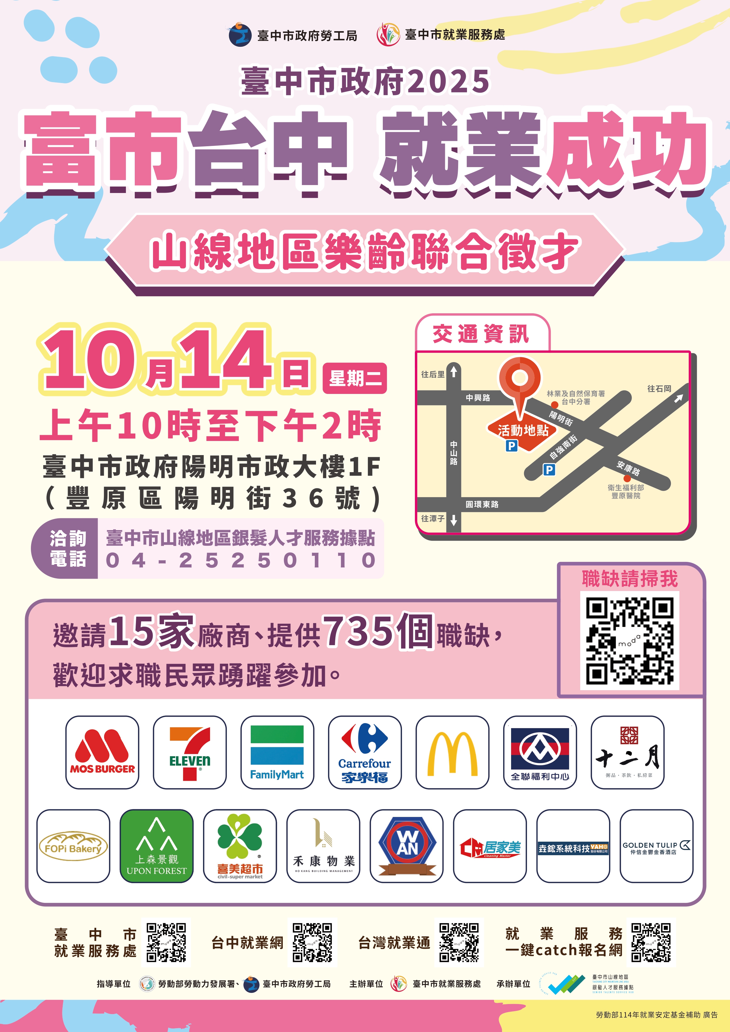 公告資訊 轉知臺中市政府勞工局辦理「富市台中 就業成功」山線地區樂齡聯合徵才 發布日期 2025/10/02~2025/10/14 | 發佈單位: 勞工處就業服務科 | 發佈日期: 王小姐 7532420 | 更新日期 2025/10/02 | 瀏覽人數: 16人 臺中市政府勞工局於10/14(二)上午10時至下午2時在陽明市政大樓舉辦「山線地區樂齡聯合徵才」,邀請麥當勞、家樂福及全家便利商店等15家廠商提供超過700個工作機會,歡迎參加。活動詳情:https://gov.tw/XJo。