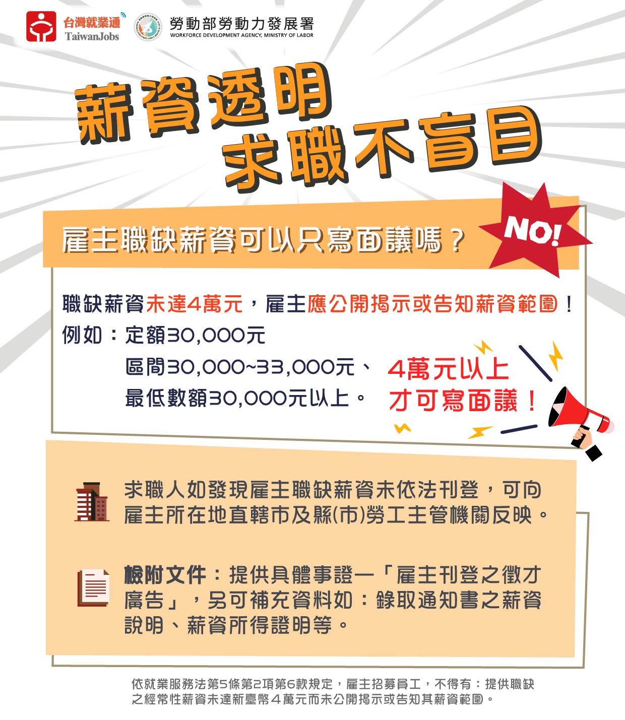 公告資訊 轉知勞動部「就業服務法第5條第2項第6款」薪資揭示宣導圖卡 發布日期 2025/11/03~2025/12/03 | 發佈單位: 勞工處就業服務科 | 發佈日期: 鍾先生\ 7532419分機2419 | 更新日期 2025/11/03 | 瀏覽人數: 30人 依據就業服務法第5條第2項第6款規定略以,雇主招募或僱用員工,不得有提供職缺之經常性薪資未達新臺幣4萬元而未公開揭示或告知其薪資範圍之情事。 請雇主遵守上開規定,落實薪資揭示義務。亦請求職人於求職過程多加留意。