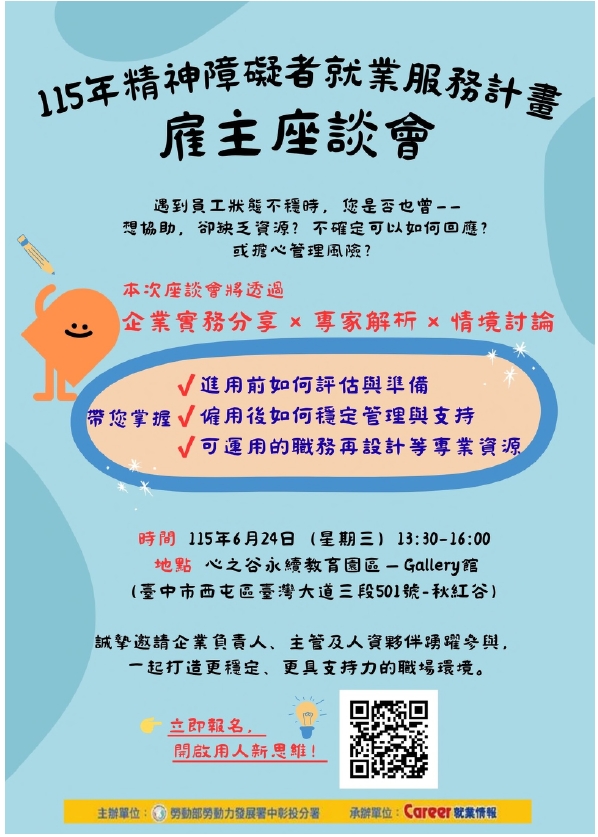 公告資訊 轉知勞動部勞動力發展署中彰投分署委託就業情報資訊股份有限公司辦理「115年精神障礙者就業服務計畫雇主座談會」 發布日期 2026/04/27~2026/06/03 | 發佈單位: 勞工處 | 發佈日期: 唐嘉慧 7532483分機2483 | 更新日期 2026/04/27 | 瀏覽人數: 14人 一、勞動部勞動力發展署中彰投分署委託就業情報資訊股份有限公司訂於115年6月24日(星期三)下午1時30分至下午4時假心之谷永續教育園區─Gallery館(臺中市西屯區臺灣大道三段501號),辦理「115年精神障礙者就業服務計畫雇主座談會」,歡迎事業單位踴躍報名參加。 二、報名方式:即日起受理報名,請於115年6月3日(星期三)前完成線上報名作業(網址:https://www.surveycake.com/s/VXzrO ),或以電子郵件回傳報名表至:sing0728@wda.gov.tw,報名後若無收到回復已報名之信件,請來電確認,洽詢活動聯絡人:中彰投分署 諮詢服務及給付科 李小姐, 連絡電話:04-2359-2181分機2355。