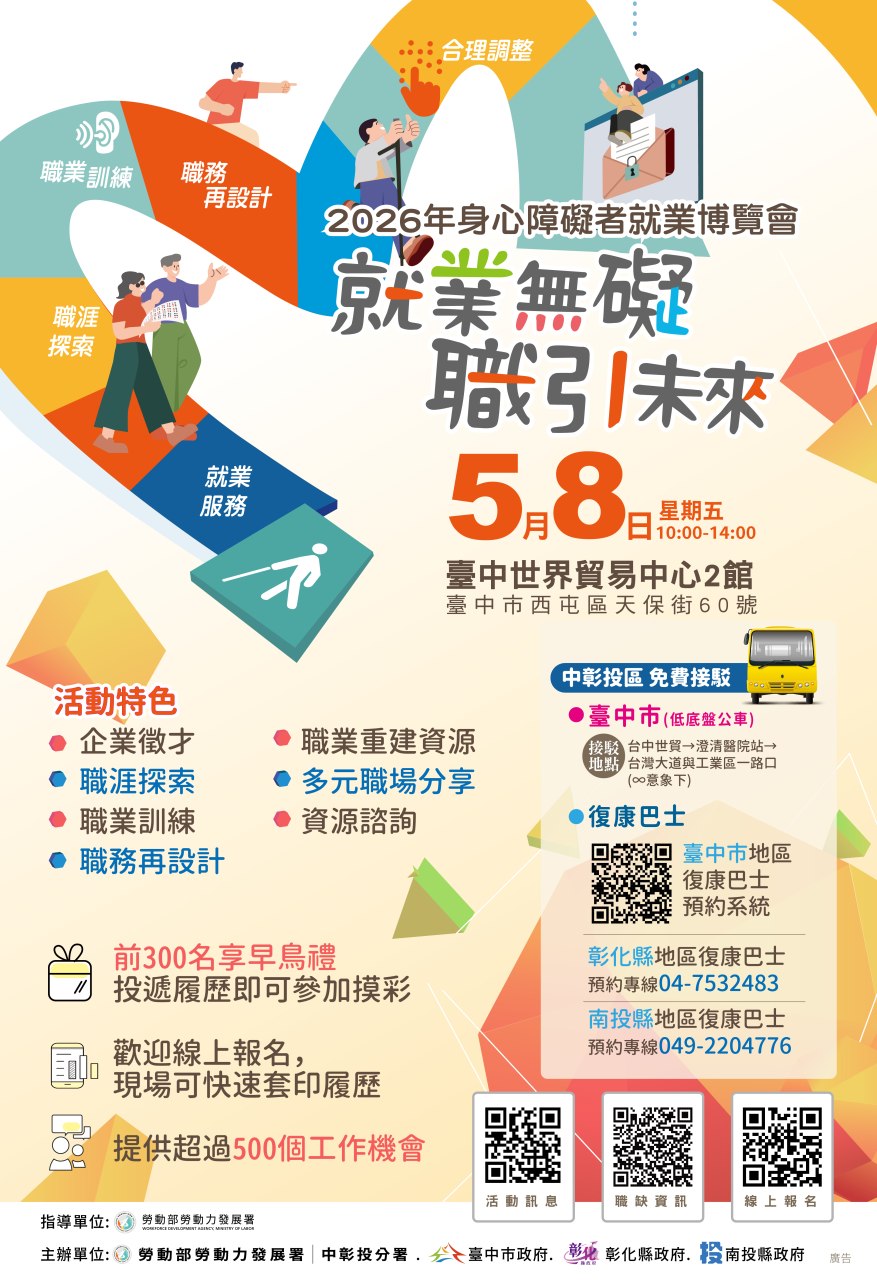 公告資訊 「就業無礙 職引未來-2026年身心障礙者就業博覽會」將於5月8日在臺中世貿中心2館登場! 發布日期 2026/04/27~2026/05/27 | 發佈單位: 勞工處就業服務科 | 發佈日期: 鍾先生 7532419分機2419 | 更新日期 2026/04/27 | 瀏覽人數: 25人 ◎活動簡介 勞動部勞動力發展署中彰投分署與轄內臺中市、彰化縣及南投縣等3縣市政府即將在今(115)年的5月8日(星期五)上午10時至下午2時,在臺中世界貿易中心2館共同為身心障礙朋友舉辦「就業無礙 職引未來-2026年身心障礙者就業博覽會」。 ◎本次活動特色: 徵才活動及履歷E化:現場集結27家企業熱烈徵才,涵蓋定額進用及多家友善企業,釋出超過500個多元職缺,從科技、製造到餐飲與醫療服務通通有!還提供超便利的E化履歷套印服務,線上報名後,現場憑身分證或QR Code就能快速列印履歷,輕鬆應徵不卡關! 職涯探索:邀請深耕身心障礙領域多年的專業講師現場提供一對一諮詢,搭配「哈利找伯樂」互動專區,輕鬆掌握各項服務與職訓資訊;再透過專業表單與牌卡工具進行深度引導,陪你練習面試話術、強化表達力,減少求職焦慮、提升準備度,讓找工作更有信心、更有方向! 職業訓練:邀請地方政府補助的身心障礙者職訓專班訓練單位進駐,現場帶來清潔、收銀、操作技術、加工與包裝等多元職務體驗,邊做邊學、激發潛能!同時結合分署自辦量測體驗,帶你認識品保工作內容;並透過合理調整成果宣導與成果展示,呈現輔助教學、個別化學習、輔具設備與無障礙環境等支持措施,讓參訓更安心、有感提升就業實力,輕鬆開啟職涯新可能! 職務再設計:整合中彰投三縣市資源與專業團隊,提供一站式諮詢服務;現場由視障咖啡師示範科技輔具應用,展現精準操作與專業力,翻轉職場想像。另安排AI應用與「合理調整」實務短講,結合面試流程優化成果展示與模擬面試及現場徵才,提供友善面試機會、強化就業競爭力;再加上「馬上好運」3D彩繪趣味體驗,讓民眾在互動中認識「合理調整」,勇敢跨越限制、開啟職涯新可能! 職業重建資源:透過趣味闖關與工作模擬、操作體驗等互動設計,帶你從職涯探索到就業媒合一次搞懂;現場提供支持性就業、庇護性就業、職業評量等服務,由專業人員即時解說。更貼心推出面試陪同服務,由就服員一對一協助,讓你更有信心踏出就業第一步!名額有限,歡迎提前向各就業中心或就業服務站洽詢預約! 友善就業典範暨多元職場分享區:規劃2場「求職者專場:職再賦能,看見無限可能」,邀請視障職場達人分享如何運用職務再設計與輔具發揮專業,並由資深督導帶你掌握環境調整與資源申請技巧,精準定位職涯;同時推出1場「企業專場:金展榮耀與資源導覽」,由金展獎企業與示範單位分享用人實務與產業趨勢,交流支持措施,將企業社會責任(CSR)轉化為企業競爭力! 資源諮詢區:整合多項政府資源及補助,包含缺工獎勵(最高10萬8,000元)、跨域就業津貼(交通、租屋與搬遷補助),以及「勞工就業通」方案,結合工作崗位訓練、僱用獎助與職務再設計,助你順利就業、安心轉職! 除上述活動以外,現場還提供免費義剪服務,由專業美髮師親自操刀,為求職者打造良好的第一印象!5月8日當天還特別安排交通接駁,以服務臺中、南投及彰化地區的身障朋友,有需要者可事先預約搭乘。更多活動訊息可電洽(04)23592181分機2342洽詢。 ◎LINE線上報名→https://page.line.me/xth1795k ◎職缺查詢→https://tcnjob.wda.gov.tw ◎接駁資訊 臺中市至活動會場接駁路線(低底盤公車): 台中世貿→澄清醫院站→台灣大道與工業區一路口(∞意象下) 復康巴士: 臺中市地區復康巴士預約諮詢:04-22289111轉37317 請至「臺中市政府復康巴士預約系統」預約。 彰化縣地區復康巴士預約專線04-7532483 南投縣地區復康巴士預約專線049-2204776