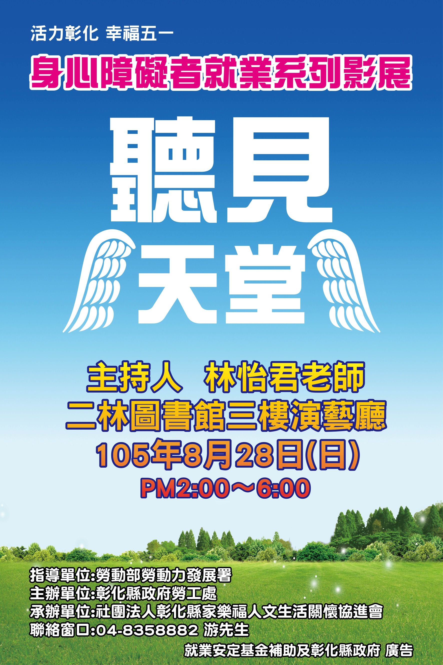 其他活動 Fun輕鬆看電影 歷史訊息 | 發布日期 2016/08/15~2016/09/15 | 發佈單位: 勞工處 | 發佈日期: 董小姐 04-7532477 | 更新日期 2016/08/15 | 瀏覽人數: 36人 FUN輕鬆看電影「聽見天堂」於8月28日(星期日)下午2~6時在二林鎮立圖書館辦理,歡迎民眾踴躍前往觀賞。本次影展入場時間為下午1時30分,採自由入座,報名專線04-8358882游先生。 彰化縣政府為促進社會大眾對身心障礙者就業議題之了解,特辦理此活動,希望藉由輕鬆且溫馨的影展方式,讓身障就業議題融入民眾的生活。「聽見天堂」是一部描述一位後天失明的視障朋友,重新適應生活及就業的心路歷程,活動亦安排身障就業專家林怡君老師擔任影評人,帶領與會人士了解身障朋友的特質及工作能力、相關就業措施及資源,讓社會大眾一起協助身心障礙者就業並創造友善環境。