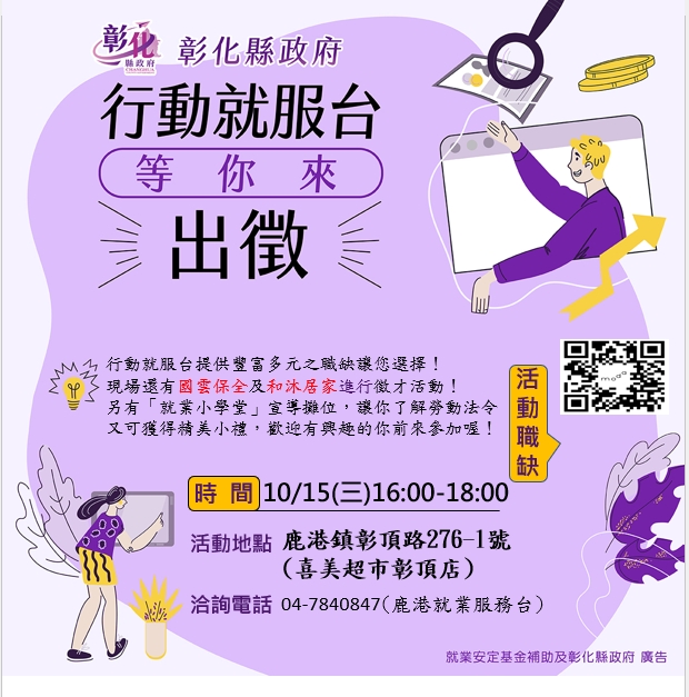 其他活動 10/15鹿港喜美超市彰頂店「行動就業服務台 等你來出徵」 發布日期 2025/10/01~2025/10/15 | 發佈單位: 勞工處就業服務科 | 發佈日期: 王靜儀 7840847 | 更新日期 2025/10/01 | 瀏覽人數: 29人 廠商名稱:和沐居家、國雲保全 活動日期:10/15(三)16:00-18:00 活動地點:鹿港喜美彰頂店(鹿港鎮彰頂路276-1號) ◎秀商股份有限公司附設彰化縣私立和沐居家長照機構 活動廠商名稱及職缺:照顧服務員/5人 薪資:排班制:時薪230~460元 ◎國雲保全股份有限公司 活動廠商名稱及職缺:保全員/5人 薪資:月薪30,000~36,000元 洽詢電話:04-7840847鹿港就服台