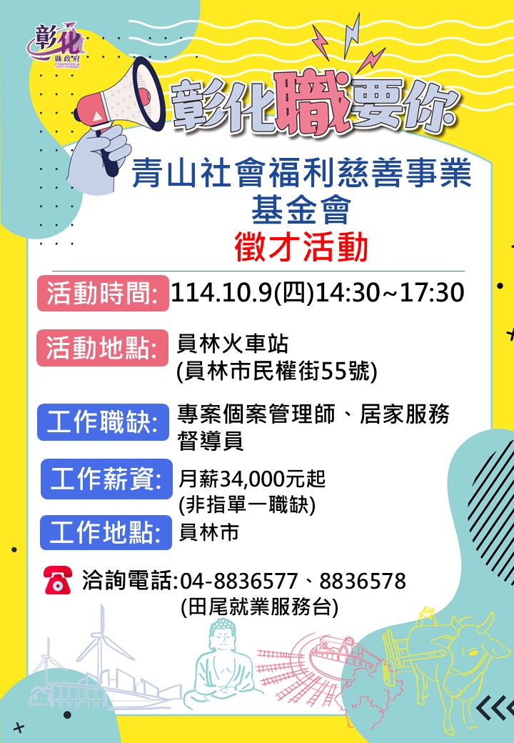 其他活動 10/9青山單一徵才(員林火車站) 發布日期 2025/10/01~2025/10/09 | 發佈單位: 勞工處就業服務科 | 發佈日期: 田尾就服台 04-8836577 | 更新日期 2025/10/01 | 瀏覽人數: 79人 《置頂》 10/9青山單一徵才(員林火車站) 性 質:廠商單一徵才活動 廠商名稱:青山社會福利慈善事業基金會 ⌛️時 間:114/10/9(四)14:30-17:30 📌地 點:員林火車站(員林市民權街55號) 職業名稱:專案個案管理師、居家服務督導員 薪 資:月薪34,000元起(非指單一職缺) 教育程度:高中職以上 工作地點:員林市 ☎️連絡電話:04-8836577 04-8836578 田尾就服台