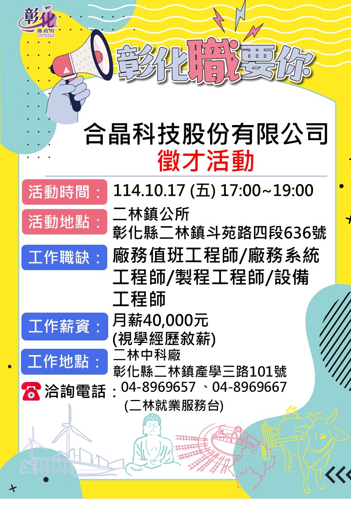 其他活動 10/17合晶科技單一徵才 發布日期 2025/10/01~2025/10/16 | 發佈單位: 勞工處就業服務科 | 發佈日期: 許希謙 8969657 | 更新日期 2025/10/01 | 瀏覽人數: 31人 10/17合晶科技單一徵才 性 質:廠商單一徵才活動 廠商名稱:合晶科技股份有限公司 ⌛️時 間:114/10/17(五)17:00-19:00 📌地 點:二林鎮公所停車場(二林鎮斗苑路四段636號) 職業名稱:廠務值班工程師/廠務系統工程師/製程工程師/設備工程師 薪 資:月薪 40,000元(視學經歷敘薪) 教育程度:高中職以上 工作地點:二林中科廠彰化縣二林鎮產學三路101號 ☎️洽詢電話:04-8969657、04-8969667二林就服台