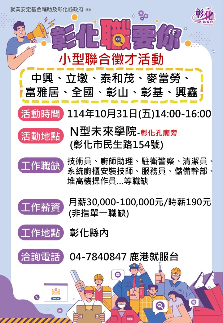 其他活動 🎉🎉🎉10/31小型徵才活動~~~ N型未來學院 發布日期 2025/10/01~2025/10/31 | 發佈單位: 勞工處就業服務科 | 發佈日期: 王靜儀 7840847 | 更新日期 2025/10/01 | 瀏覽人數: 60人 ◎活動時間:10/31(五)下午2時-4時 ◎活動地點: N型未來學院(彰化市民生路154號) ◎活動廠商:中興、立墩、全國、泰和茂、麥當勞、富雅居、彰山、彰基、興鑫 ◎活動職缺: 技術員、廚師助理、駐衛警察、清潔員、系統廚櫃安裝、技師、服務員、儲備幹部、堆高機操作員等…職缺 ◎薪資: 月薪30,000-100,000元、時薪190元 (非指單一職缺) ~~~~洽詢電話: 04-7840847 鹿港就服台~~~~ ◎廠商介紹: 1. 中興保全:以「中保無限+」服務體系為主軸,提供科技整合應用的服務。 2. 全國加油站: 上櫃上市(股票代號:9937)目前全省各縣市都有服務據點。 3. 彰基:目前台灣中部最大的醫學中心。 4. 麥當勞:當今全球規模最大的速食連鎖企業,以人為本是重要的核心價值。 5. 富雅居:營業項目:系統櫃/廚櫃/木製家具製造,經營理念為『用心服務』。 6. 泰和茂:營業項目:建築工程業,讓家成為理想生活實現心中夢想的基地。 7. 興鑫:營業項目:金屬製品製造業(熱處理加工),製程服務一條龍化控管。 8. 立墩:台灣一次性紙類和塑料包裝容器的領先製造商。 9. 彰山環保:彰基、漢銘等大型醫院指定配合洗地打蠟、病蟲害消毒工作。