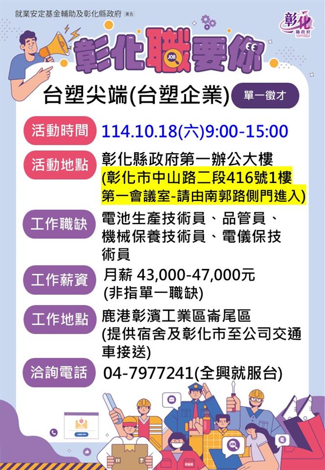 其他活動 10/18台塑尖端(台塑企業)單一徵才 發布日期 2025/10/08~2025/10/18 | 發佈單位: 勞工處就業服務科 | 發佈日期: 張小姐 7977241 | 更新日期 2025/10/08 | 瀏覽人數: 24人 《置頂》 性 質:單一廠商徵才活動 廠商名稱:(台塑企業)台塑尖端能源科技股份有限公司 活動時間:114年10月18日(星期六) 9:00 ~ 15:00 活動地點:彰化縣政府第一辦公大樓【彰化市中山路二段416號1樓】 ※第一會議室-請由南郭路側門進入 職業名稱:生產技術技術員、品管員、機械保養技術員、電儀保技術員 薪 資:43,000-47,000元(非指單一職缺) 公司簡介:台塑新智能2023年透過子公司「台灣尖端能源」在彰濱工業區投資上百億元,建造全台灣規模最大的5GWh鋰鐵電芯及模組廠,為電動車及儲能系統提供安全、穩定的鋰鐵電芯,打造完整的國產電池產業鏈,開啟台灣新能源產業的新紀元。 福利制度: 年資每滿五年贈1枚24K紀念金幣、每年固定調薪制度、高於業界水準的年終及三節獎金、員工及眷屬至長庚醫院就醫補助、免費健檢、保健諮詢服務、電動機車換購補助1.6萬元、新購補助1萬元、生日禮物券、三節福利券、春秋兩季員工郊遊、踏青補助、歲末年終歡樂聚餐、0到6歲每月2千元育兒補助、懷孕福袋、寶寶禮品及禮金、子女教育獎學金 工作內容:電池製造業 雇用人數:共33人 教育程度:不拘 交通能力:1.自行前往2.提供宿舍3.彰化市至公司交通車接送 工作地點:鹿港彰濱產業園區崙尾區 工作時間:日班、輪班(四班三輪) 僱用期限:長期性 洽詢電話:04-7977241(全興就服台)