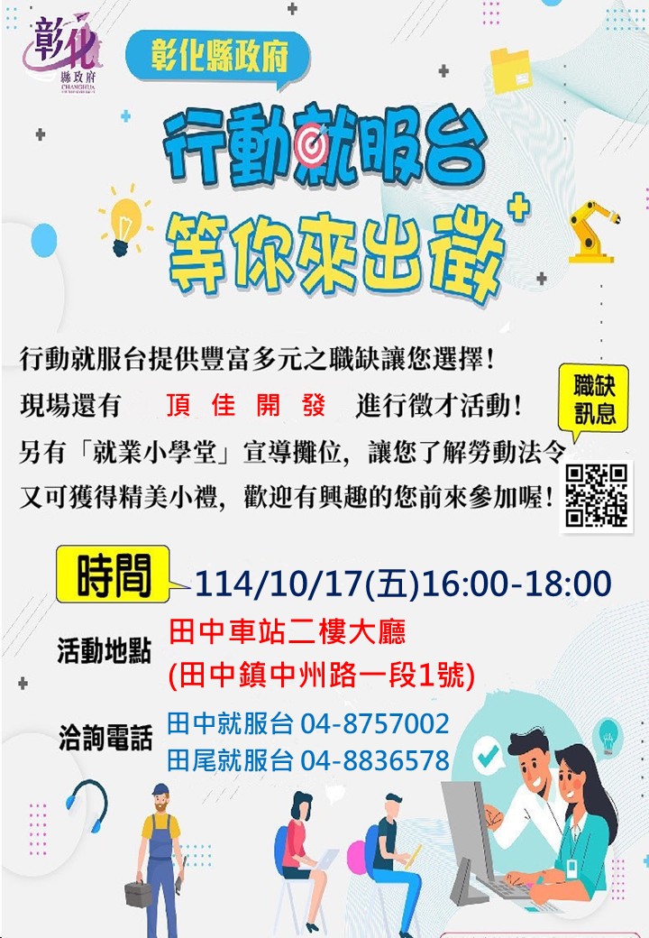 其他活動 10/17行動就服台等你來出徵 徵才活動 發布日期 2025/10/09~2025/10/17 | 發佈單位: 勞工處 | 發佈日期: 田中就服台 04-8757002 | 更新日期 2025/10/09 | 瀏覽人數: 29人 廠商名稱:頂佳開發 活動日期:10/17(五)16:00-18:00 活動地點:田中車站二樓大廳(田中鎮中州路一段1號) ◎頂佳開發 職缺:外場服務人員、餐飲服務人員、吧台人員 薪資:排班制:時薪200元、30,000-40,000元(非單一職缺) 洽詢電話:04-8757002田中就服台