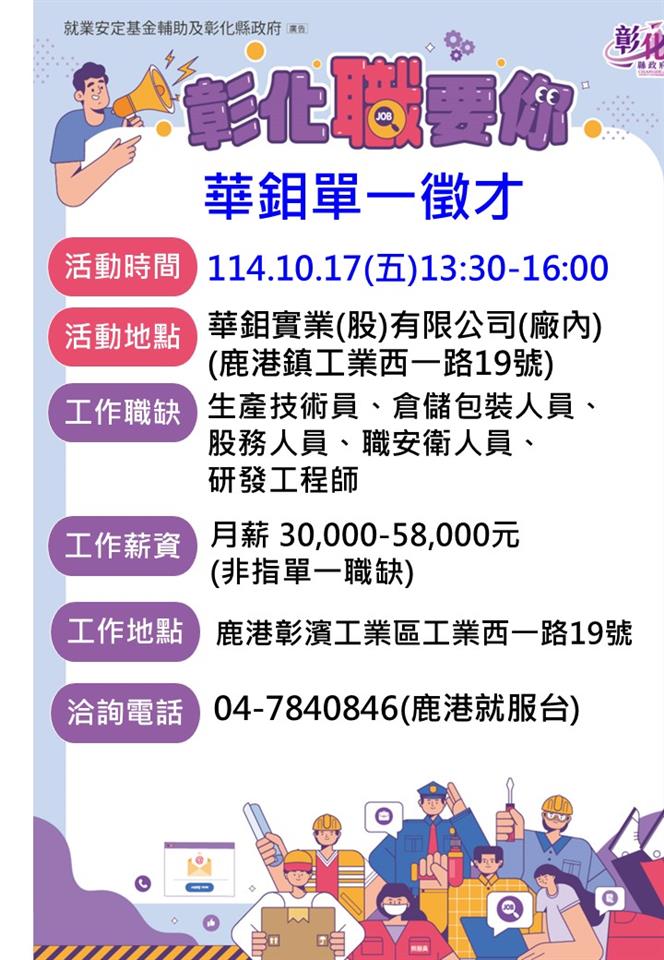 其他活動 10/17華鉬單一徵才 發布日期 2025/10/11~2025/10/17 | 發佈單位: 勞工處就業服務科 | 發佈日期: 陳小姐 04-7840846 | 更新日期 2025/10/11 | 瀏覽人數: 27人 《置頂》 性 質:單一廠商徵才活動 廠商名稱:華鉬實業股份有限公司 活動時間:114年10月17日(星期五) 13:30~ 16:00 活動地點:華鉬公司廠內【鹿港鎮工業西一路19號】 職業名稱:生產技術員、倉儲包裝人員、股務人員、職安衛人員、研發工程師 薪 資:30,000-58,000元(非指單一職缺) 公司簡介: 華鉬實業股份有限公司創立於1998年,並於2023年9月正式上櫃,產製稀有金屬精密化工以及鉬釩鎢特殊合金鐵等製品,並經營綠能電池材料,以發展本土精密化工材料能源科技的高附加價值產品為榮 福利制度: 1.全勤獎金 2.年終獎金 3.三節獎金/禮品 4.績效獎金 5.員工紅利(以公司獲利前提下提撥發放) 6.專案獎金 7.特殊功績獎金、留任獎金...等獎勵金 工作內容: 1.生產技術員-負責生產機器、設備之操作與維護、並維持機台正常運作。 2.倉儲包裝人員-具堆高機證照、成品包裝出貨作業等。 3.股務人員-辦理股務相關作業及股務代理機構溝通窗口等。 4.職安衛人員-且備職業安全衛生管理證照(甲種或乙種),無經驗可。 5.研發人員-製程條件改良及測試、新產品開發 、協助各項研究計畫推動等。 雇用人數:共8人 教育程度:不拘以上 工作地點:鹿港彰濱工業區工業西一路19號 工作時間:日班、輪班 洽詢電話:04-7840846(鹿港就服台)
