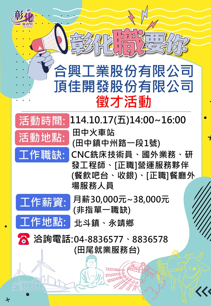 其他活動 10/17合興&頂佳徵才活動(田中火車站) 發布日期 2025/10/14~2025/10/17 | 發佈單位: 勞工處就業服務科 | 發佈日期: 田尾就服台 04-8836577 | 更新日期 2025/10/14 | 瀏覽人數: 47人 《置頂》 10/17合興&頂佳徵才活動(田中火車站) 性 質:廠商徵才活動 廠商名稱:合興工業股份有限公司&頂佳開發股份有限公司 ⌛️時 間:114/10/17(五)14:00-16:00 📌地 點:田中火車站(田中鎮中州路一段1號) 職業名稱:CNC銑床技術員、國外業務、研發工程師、[正職]營運服務夥伴(餐飲吧台、收銀)、[正職]餐廳外場服務人員 薪 資:月薪30,000~38,000元(非指單一職缺) 教育程度:高中職以上 工作地點:北斗鎮、永靖鄉 ☎️連絡電話:04-8836577 04-8836578 田尾就服台