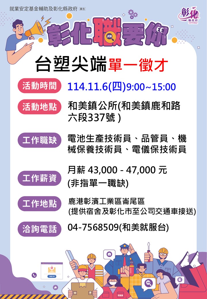 其他活動 🌸 11/6台塑尖端單一徵才(和美場次) 發布日期 2025/10/27~2025/11/06 | 發佈單位: 勞工處就業服務科 | 發佈日期: 林小姐 7568509 | 更新日期 2025/10/27 | 瀏覽人數: 31人 11/6台塑尖端單一徵才(和美場次) 🌸加入台塑,打造高薪人生🌸 廠商名稱:台塑尖端能源科技股份有限公司 🌱🌱 活動時間:114年11月6日(星期四) 9:00 ~ 15:00 活動地點:和美鎮公所(和美鎮鹿和路六段337號) 職業名稱:電池生產技術員、品管員、機械保養技術員、電儀保技術員 薪 資:43,000-47,000元 ((輪班有輪班津貼) 工作內容:電池製造業 教育程度:高中以上 交通能力:1.能自行前往🚴♂️2.提供住宿🏢 3.彰化市至公司交通車接送🚌 工作地點:鹿港彰濱工業區崙尾區 工作時間:日班、輪班(四班三輪) 僱用期限:長期性 💌洽詢電話:04-7568509和美就服台 😊😊 公司簡介:台塑新智能2023年透過子公司「台灣尖端能源」在彰濱工業區投資上百億元,建造全台灣規模最大的5GWh鋰鐵電芯及模組廠,為電動車及儲能系統提供安全、穩定的鋰鐵電芯,打造完整的國產電池產業鏈,開啟台灣新能源產業的新紀元。 福利制度: 年資每滿五年贈1枚24K紀念金幣、每年固定調薪制度、高於業界水準的年終及三節獎金、員工及眷屬至長庚醫院就醫補助、免費健檢、保健諮詢服務、電動機車換購補助1.6萬元、新購補助1萬元、生日禮物券、三節福利券、春秋兩季員工郊遊、踏青補助、歲末年終歡樂聚餐、0到6歲每月2千元育兒補助、懷孕福袋、寶寶禮品及禮金、子女教育獎學金