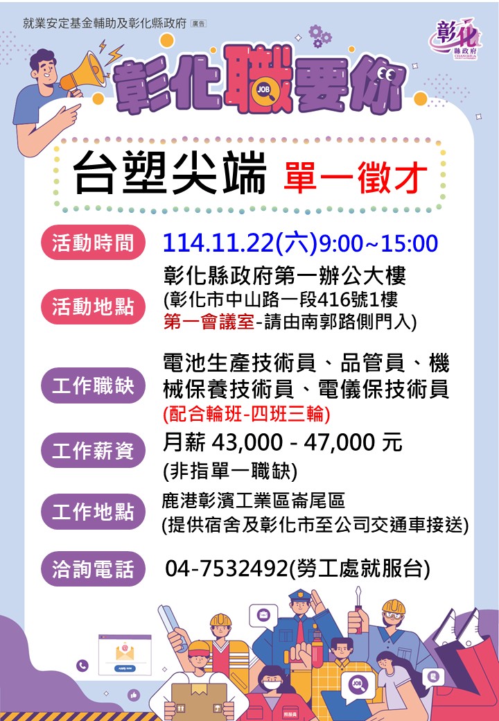 其他活動 🔋11/22【台塑尖端單一徵才】🔋找工作?快快來!我們在縣府第一會議室面試呦~ 發布日期 2025/11/06~2025/11/22 | 發佈單位: 勞工處就業服務科 | 發佈日期: 勞工處就服台 04-7532492 | 更新日期 2025/11/06 | 瀏覽人數: 32人 🌟廠商名稱:台塑尖端能源科技股份有限公司 🌟 🕘活動時間:114年11月22日 星期六 9:00 ~ 15:00 🕒 活動地點:彰化縣政府第一辦公大樓 (彰化市中山路一段416號1樓 第一會議室-請由南郭路側門入) 職業名稱:電池生產技術員、品管員、機械保養技術員、電儀保技術員、生產技術技術員 (配合輪值-四班三輪) 💰薪 資:43,000-47,000元(非指單一職缺) 💰 💎公司簡介:台塑新智能2023年透過子公司「台灣尖端能源」在彰濱工業區投資上百億元,建造全台灣規模最大的5GWh鋰鐵電芯及模組廠,為電動車及儲能系統提供安全、穩定的鋰鐵電芯,打造完整的國產電池產業鏈,開啟台灣新能源產業的新紀元。 福利制度: 年資每滿五年贈1枚24K紀念金幣、每年固定調薪制度、高於業界水準的年終及三節獎金、員工及眷屬至長庚醫院就醫補助、免費健檢、保健諮詢服務、電動機車換購補助1.6萬元、新購補助1萬元、生日禮物券、三節福利券、春秋兩季員工郊遊、踏青補助、歲末年終歡樂聚餐、0到6歲每月2千元育兒補助、懷孕福袋、寶寶禮品及禮金、子女教育獎學金 工作內容:電池製造業 交通能力:1.自行前往2.提供宿舍3.彰化市至公司交通車接送 工作地點:鹿港彰濱工業區崙尾區 工作時間:日班、輪班(四班三輪) 洽詢電話:04-7532492 (勞工處就服台)
