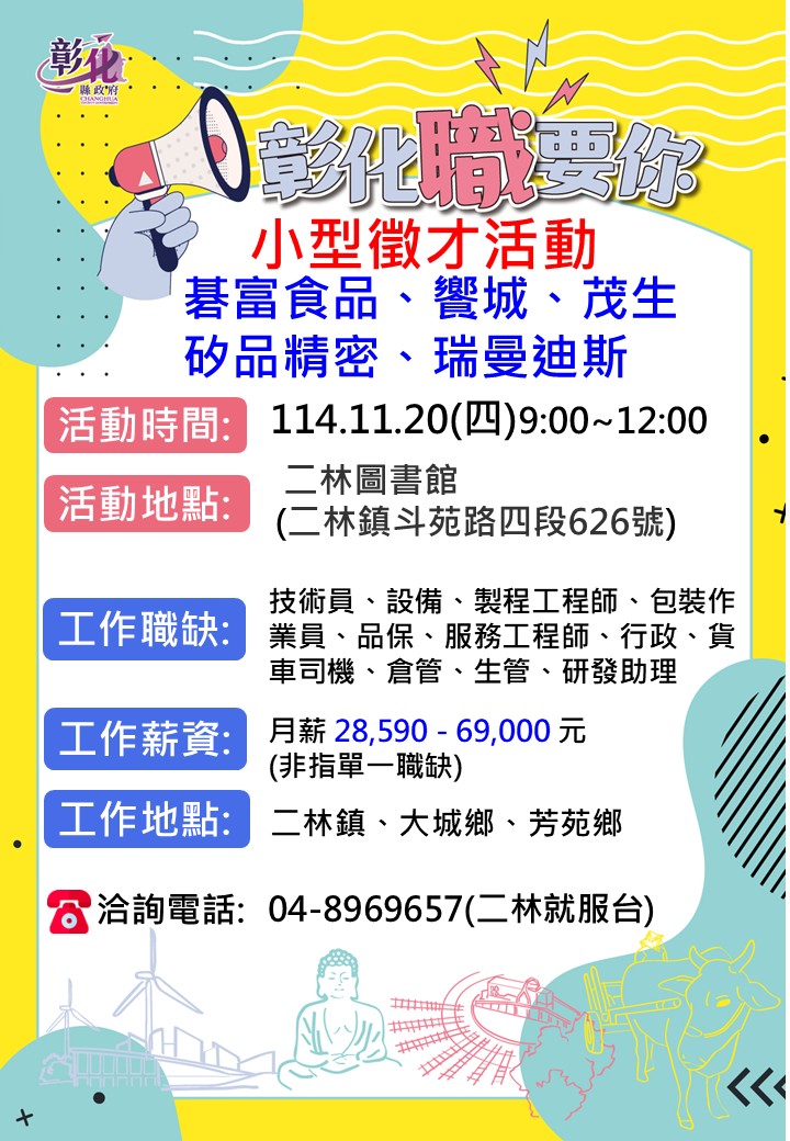 其他活動 11/20小型聯合徵才-二林圖書館 發布日期 2025/11/11~2025/11/20 | 發佈單位: 勞工處就業服務科 | 發佈日期: 邱先生 04-8969657 | 更新日期 2025/11/11 | 瀏覽人數: 7人 11/20小型聯合徵才活動 性 質:小型廠商徵才活動 廠商名稱:矽品精密、碁富食品、瑞曼迪斯、饗城、茂生食品 活動時間:114年11月20日(星期四)9:00-12:00 活動地點:二林圖書館(二林鎮斗苑路四段626號) 活動職缺:技術員、設備、製程工程師、包裝作業員、品保、服務工程師、行政、貨車司機、倉管、生管、研發助理等 工作地點:二林、芳苑、大城 薪資分佈:月薪28,590~69,000元/非指單一職缺 工作時間:依公司規定 洽詢電話:二林就服台04-8969657 來就送精美小禮物,送完為止
