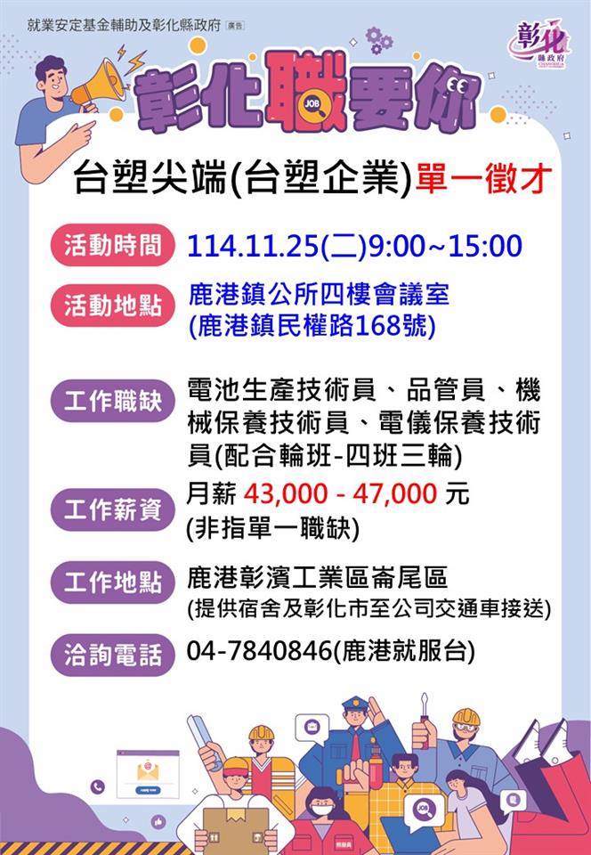 其他活動 📢11/25台塑尖端(台塑企業)單一徵才(鹿港) 發布日期 2025/11/14~2025/12/14 | 發佈單位: 勞工處就業服務科 | 發佈日期: 陳小姐 04-7840846 | 更新日期 2025/11/14 | 瀏覽人數: 43人 《置頂》 性 質:單一廠商徵才活動 廠商名稱:(台塑企業)台塑尖端能源科技股份有限公司 活動時間:114年11月25日(星期二) 9:00 ~ 15:00 (因11/12颱風順延至11/25辦理) 活動地點:鹿港鎮公所4樓會議室【鹿港鎮民權路168號】 職業名稱:資材管理員、生產技術技術員、品管員、機械保養技術員、電儀保技術員 薪 資:43,000-47,000元(非指單一職缺) 公司簡介:台塑新智能2023年透過子公司「台灣尖端能源」在彰濱工業區投資上百億元,建造全台灣規模最大的5GWh鋰鐵電芯及模組廠,為電動車及儲能系統提供安全、穩定的鋰鐵電芯,打造完整的國產電池產業鏈,開啟台灣新能源產業的新紀元。 福利制度: 年資每滿五年贈1枚24K紀念金幣、每年固定調薪制度、高於業界水準的年終及三節獎金、員工及眷屬至長庚醫院就醫補助、免費健檢、保健諮詢服務、電動機車換購補助1.6萬元、新購補助1萬元、生日禮物券、三節福利券、春秋兩季員工郊遊、踏青補助、歲末年終歡樂聚餐、0到6歲每月2千元育兒補助、懷孕福袋、寶寶禮品及禮金、子女教育獎學金 工作內容:電池製造業 雇用人數:共33人 教育程度:不拘 交通能力:1.自行前往2.提供宿舍3.彰化市至公司交通車接送 工作地點:鹿港彰濱工業區崙尾區 工作時間:日班、輪班(四班三輪) 僱用期限:長期性 洽詢電話:04-7840846(鹿港就服台)