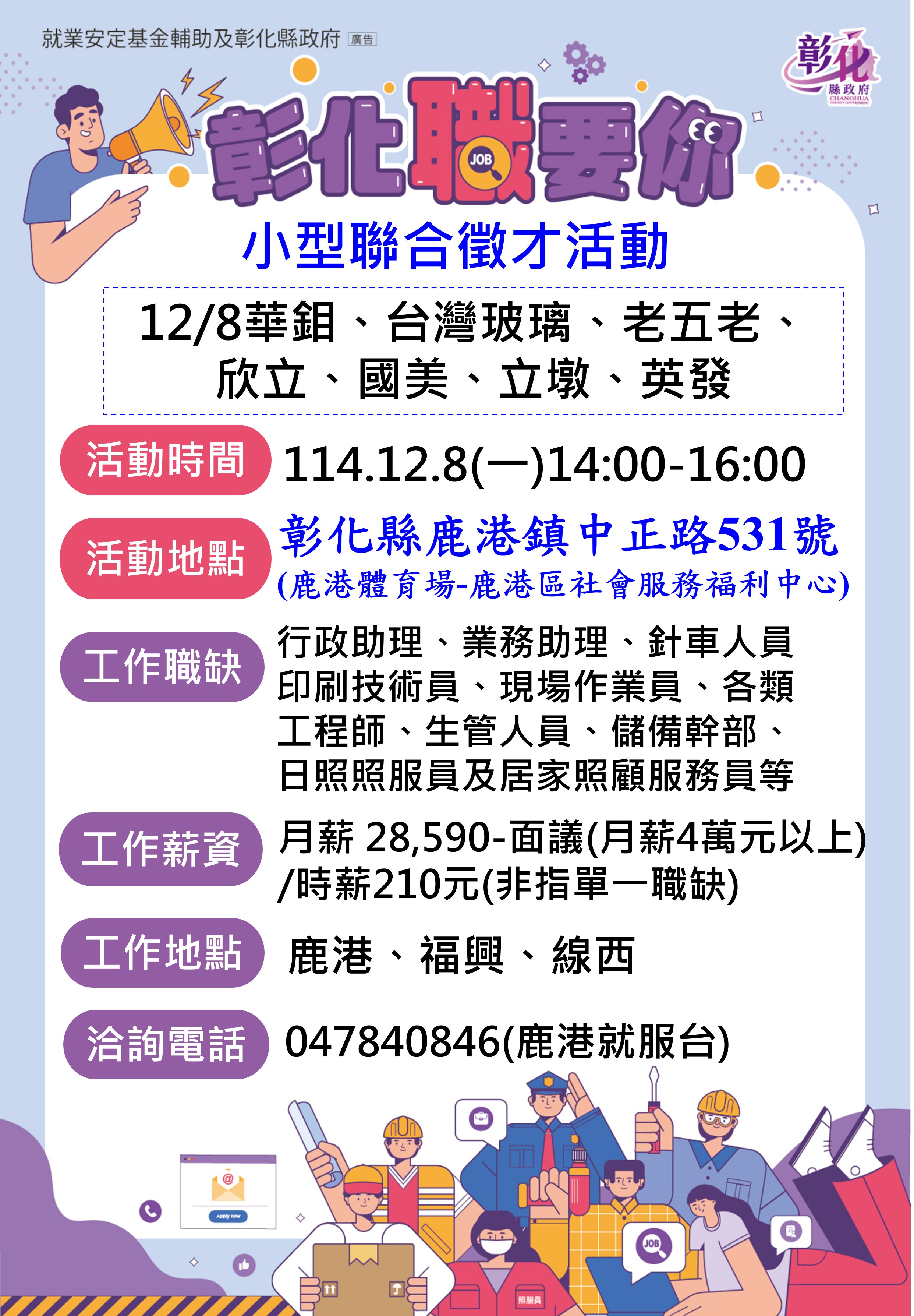 其他活動 📢12/8小型徵才活動(鹿港體育場) 發布日期 2025/11/28~2025/12/08 | 發佈單位: 勞工處就業服務科 | 發佈日期: 鹿港就業服務台 04-7840846 | 更新日期 2025/11/28 | 瀏覽人數: 50人 性 質:12/8小型徵才活動 徵才廠商:華鉬、台灣玻璃、老五老、欣立、國美、立墩、英發 活動時間:114年12月8日(星期一) 14:00-16:00 活動地點:彰化縣鹿港鎮中正路531號(鹿港體育場-鹿港區社會服務福利中心) 活動職缺: 1.華鉬(鹿港):現場技術員、倉管包裝人員、職安衛人員、股務人員、國外業務專員/亞洲線、國外業務專員/歐美線、會計管理師、研發工程師 2.台灣玻璃(鹿港):鹿港廠/平板廠助工師(需輪班)、鹿港廠儲備幹部、鹿港廠驗布人員(需輪班) 、鹿港廠熔解控制工程師、鹿港廠窯爐工程師、鹿港廠合金人員、鹿港廠鍋爐操作人員、鹿港廠空壓機及冰水機操作人員、鹿港廠機械設計員、鹿港廠電氣人員(需輪班)、鹿港廠儀測人員、鹿港廠化驗人員(檢驗)、鹿港廠化驗人員(化驗)、鹿港廠驗纖人員、鹿港廠職安管理師、鹿港廠物料倉管員、廠護、鹿港廠廠務土木助工師、鹿港廠品管客服工程師、鹿港廠化工人員(需輪中班)、鹿港平板廠熱端工程師、鹿港平板廠板驗人員(需輪班)、鹿港平板廠維修人員、鹿港平板廠儀電人員(需輪班)、鹿港平板廠倉儲人員(堆高機) 3.老五老(鹿港):日照照服員(鹿港、和美)、居家服務員(鹿港、福興、和美、伸港、線西)、日照社工(鹿港)、居服督導員 4.欣立(福興):行政助理、業務助理、針車人員 5.國美(鹿港、線西):環境清潔人員 6.立墩(鹿港):生技工程師、成型作業員、印刷技術員、現場整理員 7.英發(福興):生產儲備幹部、生管人員、工業設計師、模具主管、製圖人員 雇用人數:128人 教育程度:不拘 工作地點:鹿港、福興、線西 薪 資:月薪 28,590-面議(月薪4萬元以上)/時薪210元