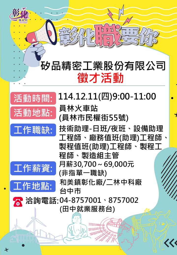 其他活動 12/11矽品單一徵才活動 發布日期 2025/12/02~2025/12/11 | 發佈單位: 勞工處就業服務科 | 發佈日期: 田中就服台 04-8757002 | 更新日期 2025/12/02 | 瀏覽人數: 15人 🔥矽品精密員林車站徵才活動🔥 性 質:單一徵才活動 廠商名稱:矽品精密 ⏰時 間:114年12月11日(四)9:00-11:00 地 點:員林火車站(員林市民權街55號) 職業名稱:技術助理-日班/夜班、設備助理工程師、廠務值班(助理)工程師、製程值班(助理)工程師、製程工程師、製造組主管等 等諸多職缺 薪 資:月薪30,700-69,000元以上 (非指單一職缺) 工作地點: 彰化/中科二林廠/台中市 ☎️連絡電話:04-8757001、8757002田中就服台