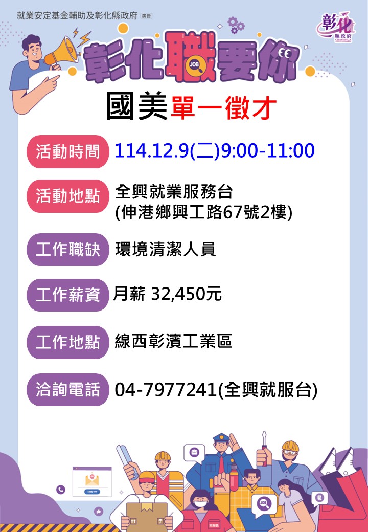 其他活動 12/9國美景觀單一徵才 發布日期 2025/12/03~2025/12/09 | 發佈單位: 勞工處就業服務科 | 發佈日期: 王麗娟 7977241 | 更新日期 2025/12/03 | 瀏覽人數: 79人 廠商名稱:國美景觀有限公司 時 間:114年12月9日(二) 09:00-11:00 地 點:全興就業服務台(伸港鄉興工路67號2樓) 職業名稱:環境清潔人員 工作內容:無經驗可 工作薪資:月薪32,450元 雇用人數:10人 教育程度:不拘 洽詢電話:04-7977241