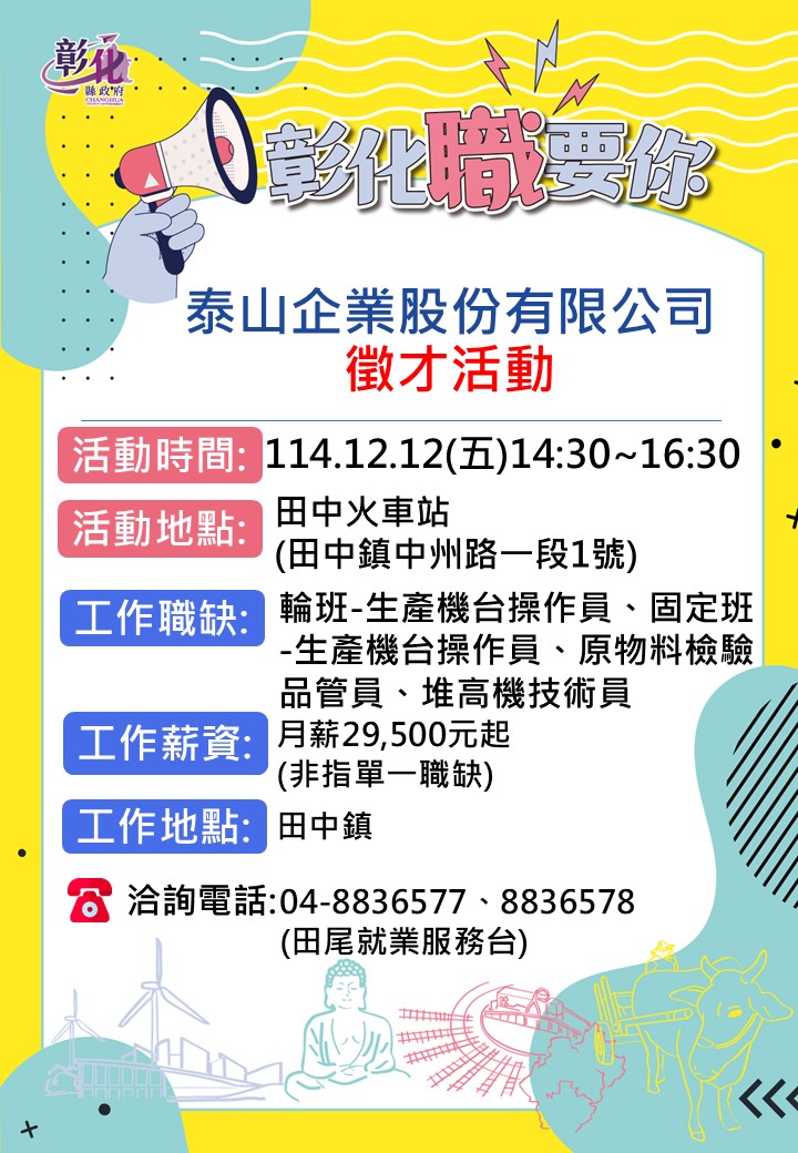 其他活動 12/12泰山單一徵才(田中火車站) 發布日期 2025/12/05~2025/12/12 | 發佈單位: 勞工處就業服務科 | 發佈日期: 田尾就服台 04-8836577 | 更新日期 2025/12/05 | 瀏覽人數: 37人 《置頂》 12/12泰山單一徵才(田中火車站) 性 質:廠商徵才活動 廠商名稱:泰山企業股份有限公司 ⌛️時 間:114/12/12(五)14:30-16:30 📌地 點:田中火車站(田中鎮中州路一段1號) 職業名稱:輪班-生產機台操作員、固定班-生產機台操作員、原物料檢驗品管員、堆高機技術員 薪 資:月薪29,500元起(非指單一職缺) 工作地點:田中鎮 ☎️連絡電話:04-8836577 04-8836578 田尾就服台