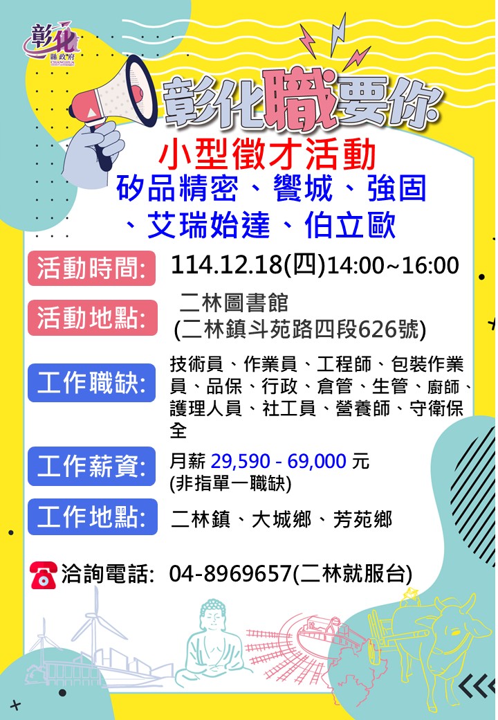 其他活動 12/18小型聯合徵才活動(二林圖書館) 發布日期 2025/12/08~2026/01/08 | 發佈單位: 勞工處就業服務科 | 發佈日期: 邱先生 04-8969657 | 更新日期 2025/12/08 | 瀏覽人數: 52人 12/18小型聯合徵才活動 性 質:小型廠商徵才活動 廠商名稱:矽品精密、艾瑞始達、強固、饗城、伯立歐 活動時間:114年12月18日(星期四)14:00-16:00 活動地點:二林圖書館(二林鎮斗苑路四段626號) 活動職缺:技術員、作業員、工程師、包裝作業員、品保、行政、倉管、生管、廚師、護理人員、社工員、營養師、守衛保全等 工作地點:二林、芳苑、大城 薪資分佈:月薪29,590~69,000元/非指單一職缺 工作時間:依公司規定 洽詢電話:二林就服台04-8969657 來就送精美小禮物,送完為止