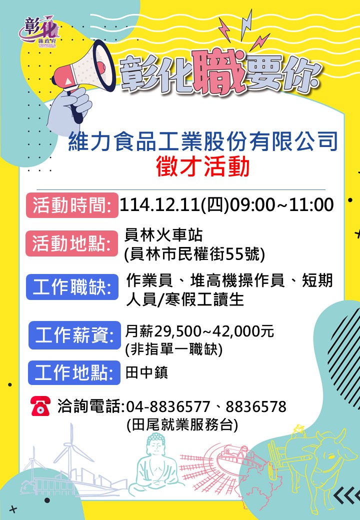 其他活動 12/11維力單一徵才(員林火車站) 發布日期 2025/12/08~2025/12/11 | 發佈單位: 勞工處就業服務科 | 發佈日期: 田尾就服台 04-8836577 | 更新日期 2025/12/08 | 瀏覽人數: 23人 12/11維力單一徵才(員林火車站) 性 質:廠商徵才活動 廠商名稱:維力食品工業股份有限公司 ⌛️時 間:114/12/11(四)09:00-11:00 📌地 點:員林火車站(員林市民權街55號) 職業名稱:作業員、堆高機操作員、短期人員/寒假工讀生 薪 資:月薪29,500~42,000元(非指單一職缺) 工作地點:田中鎮 ☎️連絡電話:04-8836577 04-8836578 田尾就服台