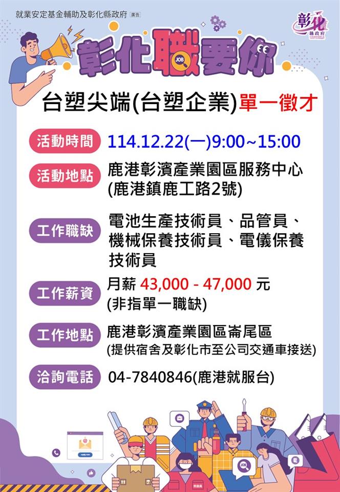 其他活動 📢12/22台塑尖端單一徵才(鹿港彰濱) 發布日期 2025/12/12~2025/12/22 | 發佈單位: 勞工處就業服務科 | 發佈日期: 陳小姐/張小姐 04-7840846/04-7840847 | 更新日期 2025/12/12 | 瀏覽人數: 41人 《置頂》 性 質:單一廠商徵才活動 廠商名稱:(台塑企業)台塑尖端能源科技股份有限公司 活動時間:114年12月22日(星期一) 9:00 ~ 15:00 活動地點:鹿港彰濱產業園區服務中心【鹿港鎮鹿工路2號】 職業名稱:生產技術技術員、品管員、機械保養技術員、電儀保技術員 薪 資:43,000-47,000元(非指單一職缺) 公司簡介:台塑新智能2023年透過子公司「台灣尖端能源」在彰濱工業區投資上百億元,建造全台灣規模最大的5GWh鋰鐵電芯及模組廠,為電動車及儲能系統提供安全、穩定的鋰鐵電芯,打造完整的國產電池產業鏈,開啟台灣新能源產業的新紀元。 福利制度: 年資每滿五年贈1枚24K紀念金幣、每年固定調薪制度、高於業界水準的年終及三節獎金、員工及眷屬至長庚醫院就醫補助、免費健檢、保健諮詢服務、電動機車換購補助1.6萬元、新購補助1萬元、生日禮物券、三節福利券、春秋兩季員工郊遊、踏青補助、歲末年終歡樂聚餐、0到6歲每月2千元育兒補助、懷孕福袋、寶寶禮品及禮金、子女教育獎學金 工作內容:電池製造業 雇用人數:共33人 教育程度:不拘 交通能力:1.自行前往2.提供宿舍3.彰化市至公司交通車接送 工作地點:鹿港彰濱產業園區崙尾區 工作時間:日班、輪班(四班三輪) 僱用期限:長期性 洽詢電話:04-7840846(鹿港就服台)