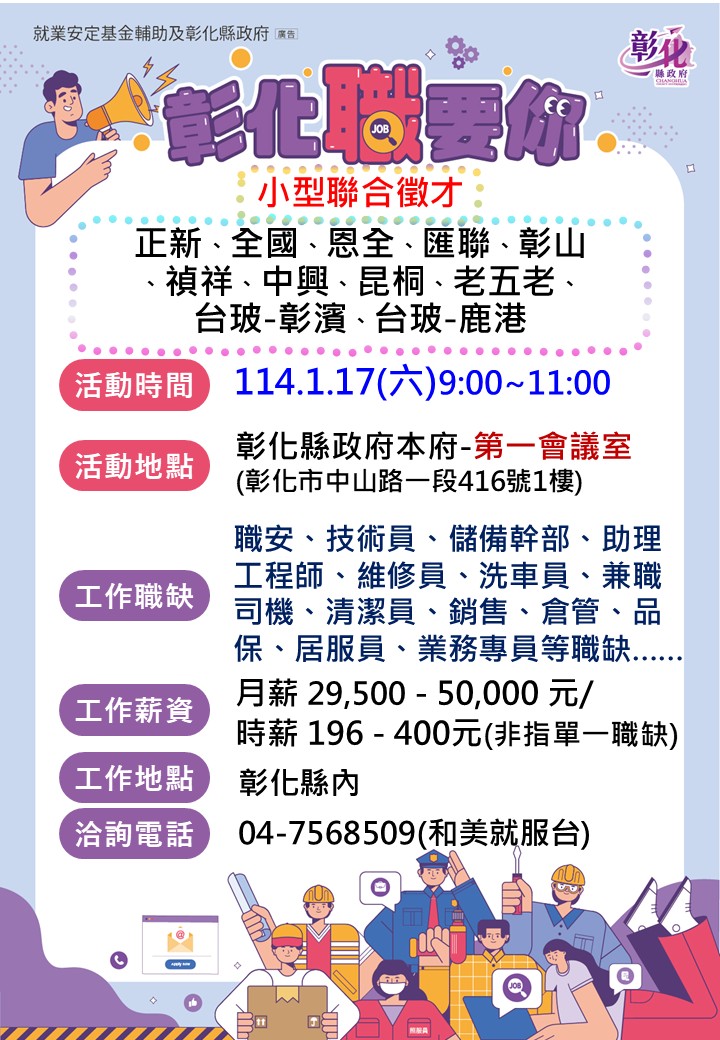 其他活動 🎉🎉🎉115/1/17小型徵才活動~~~轉職好選擇<<縣府第一會議室>> 發布日期 2025/12/29~2026/01/17 | 發佈單位: 勞工處就業服務科 | 發佈日期: 王靜儀 7568509 | 更新日期 2025/12/29 | 瀏覽人數: 151人 《置頂》 🎉🎉🎉115/1/17小型徵才活動~~~轉職好選擇<<縣府第一會議室>> ◎活動時間:115/01/17(六)9時-11時 ◎活動地點: 彰化縣政府第一辦公大樓-第一會議室(彰化市中山路一段416號1樓) ◎活動廠商: 正新、全國、恩全、匯聯、彰山、禎祥、中興、昆桐、老五老、台玻-彰濱、台玻-鹿港 ◎活動職缺:職安、技術員、儲備幹部、助理工程師、維修員、洗車員、兼職司機、清潔員、銷售、倉管、品保、居服員、業務專員等職缺 ◎薪資: 月薪29,500~50,000元、時薪196~400元(非指單一職缺) ◎洽詢電話: 04-7568509和美就服台