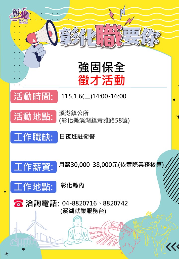 其他活動 🔥1/6強固保全溪湖公所徵才活動🔥 發布日期 2026/01/02~2026/01/06 | 發佈單位: 勞工處就業服務科 | 發佈日期: 溪湖就業服務台 04-8820716 | 更新日期 2026/01/02 | 瀏覽人數: 77人 🔥1/6強固保全溪湖公所徵才活動🔥 性 質:單一徵才活動 廠商名稱:強固保全有限公司 ⏰時 間:115年1月6日(二)14:00-16:00 地 點:溪湖鎮公所一樓 (彰化縣溪湖鎮青雅路58號) 職業名稱:日夜班駐衛警 薪 資:月薪30,000-38,000元(依實際業務或工作執行情形核算) 工作地點:彰化縣內 ☎️連絡電話:04-8820716、8820742 溪湖就服台 🔥 性 質:單一徵才活動 廠商名稱:強固保全有限公司 ⏰時 間:115年1月6日(二)14:00-16:00 地 點:溪湖鎮公所一樓 (彰化縣溪湖鎮青雅路58號) 職業名稱:日夜班駐衛警 薪 資:月薪30,000-38,000元(依實際業務或工作執行情形核算) 工作地點:彰化縣內 ☎️連絡電話:04-8820716、8820742 溪湖就服台
