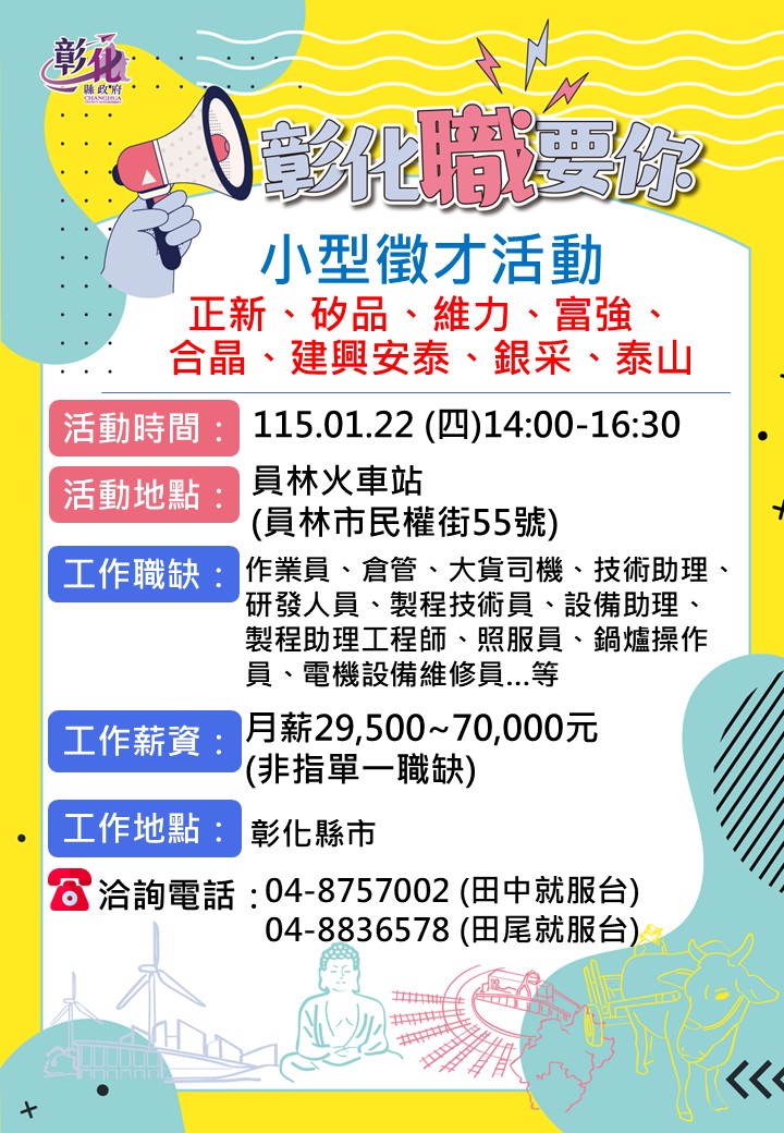 其他活動 1/22 員林火車站小型徵才活動 發布日期 2026/01/14~2026/01/22 | 發佈單位: 勞工處就業服務科 | 發佈日期: 田中就服台 04-8757002 | 更新日期 2026/01/14 | 瀏覽人數: 35人 《置頂》 1/22 員林火車站小型徵才活動 性 質:小型廠商徵才活動 廠商名稱:正新、矽品、維力、富強、合晶、建興安泰、銀采、泰山 ⌛️時間:115年1月22日(星期四) 14:00-16:30 📌地點:員林火車站(員林市民權街55號) 活動職缺:作業員、倉管、大貨司機、技術助理、研發人員、製程技術員、設備助理、製程助理工程師、照服員、鍋爐操作員、電機設備維修員...等 工作地點:彰化縣市 薪資分佈:月薪29,500~70,000元(非指單一職缺) 工作時間:依公司規定 ☎️電話:田中就服台 04-8757002 田尾就服台 04-8836578
