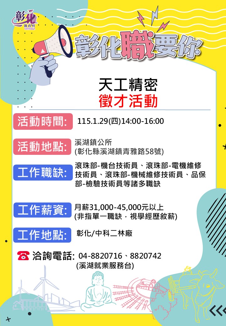 其他活動 🔥1/29天工精密單一溪湖公所徵才活動🔥 發布日期 2026/01/21~2026/01/29 | 發佈單位: 勞工處就業服務科 | 發佈日期: 溪湖就服台 04-8820716 | 更新日期 2026/01/21 | 瀏覽人數: 9人 🔥1/29天工精密單一溪湖公所徵才活動🔥 性 質:單一徵才活動 廠商名稱:天工精密 ⏰時 間:115年1月29日(四)14:00-16:00 地 點:溪湖鎮公所一樓(彰化縣溪湖鎮青雅路58號) 職業名稱:滾珠部-機台技術員、滾珠部-電機維修技術員、滾珠部-機械維修技術員、品保部-檢驗技術員、生管部-倉儲物流專員、生管部-倉管專員 薪 資:月薪31,000-45,000元以上 (非指單一職缺,視學經歷敘薪) 工作地點: 彰化縣內、二林中科 ☎️連絡電話:04-8820716 溪湖就服台