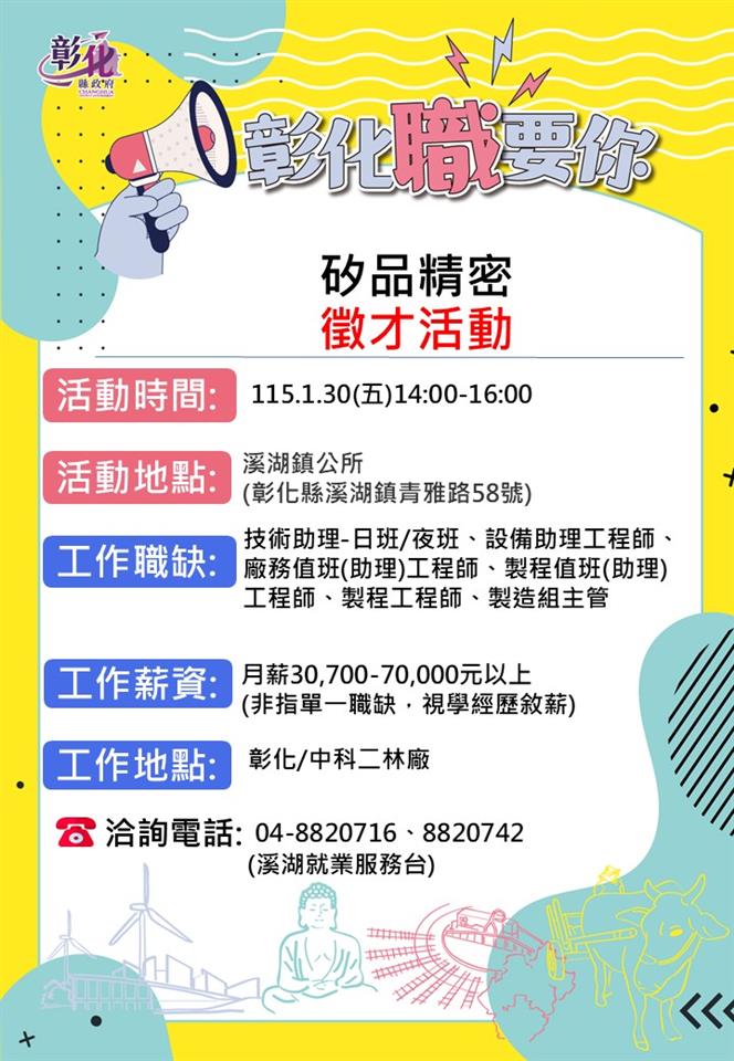 其他活動 🔥1/30矽品公司溪湖公所徵才活動🔥 發布日期 2026/01/21~2026/01/30 | 發佈單位: 勞工處就業服務科 | 發佈日期: 溪湖就服台 04-8820716 | 更新日期 2026/01/21 | 瀏覽人數: 12人 台灣製造之前,是彰化製造。 從在地走向世界,我們的驕傲來自每一雙勤奮的手。 加入我們,成為「彰化製造」的一員, 一起讓世界看見台灣的實力。 🔧 工程師徵才中|用專業築夢,用雙手創未來。 🔥1/30矽品公司溪湖公所徵才活動🔥 性 質:單一徵才活動 廠商名稱:矽品精密 ⏰時 間:115年1月30日(五)14:00-16:00 地 點:溪湖鎮公所一樓(彰化縣溪湖鎮青雅路58號) 職業名稱:技術助理-日班/夜班、設備助理工程師、廠務值班(助理)工程師、製程值班(助理)工程師、製程工程師、製造組主管、廠務系統工程師 薪 資:月薪30,700-70,000元 (非指單一職缺,視學經歷敘薪) 工作地點: 彰化縣內、二林中科 ☎️連絡電話:04-8820716 溪湖就服台