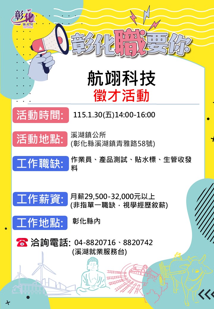 其他活動 🔥1/30航翊科技單一溪湖公所徵才活動🔥 發布日期 2026/01/21~2026/01/30 | 發佈單位: 勞工處就業服務科 | 發佈日期: 溪湖就業服務站 04-8820716 | 更新日期 2026/01/21 | 瀏覽人數: 21人 🔥1/30航翊科技單一溪湖公所徵才活動🔥 性 質:單一徵才活動 廠商名稱:航翊科技 ⏰時 間:115年1月30日(五)14:00-16:00 地 點:溪湖鎮公所一樓(彰化縣溪湖鎮青雅路58號) 職業名稱:作業員、產品測試、貼水標、生管收發料 薪 資:月薪29,500-32,000元以上 (非指單一職缺,視學經歷敘薪) 工作地點: 彰化縣內 ☎️連絡電話:04-8820716 溪湖就服台