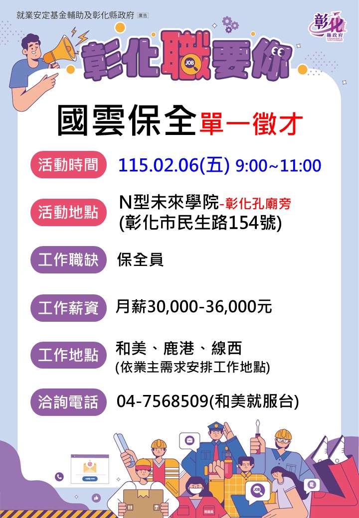 其他活動 📣0206國雲保全單一徵才活動~N型未來學院 發布日期 2026/01/22~2026/02/06 | 發佈單位: 勞工處就業服務科 | 發佈日期: 和美就服台 04-7568509 | 更新日期 2026/01/22 | 瀏覽人數: 27人 📣0206國雲保全單一徵才活動~ ☎️活動時間:115年2月6日(五)09:00-11:00⏰ 📌活動地點:N型未來學院-彰化孔廟旁(彰化市民生路154號) 💼工作職缺:保全員 工作薪資:月薪30,000~36,000元 工作地點:和美、鹿港、線西(依業主需求安排工作地點) 公司簡介: 國雲保全股份有限公司隸屬於國內保全業龍頭-中興保全科技集團(100% 轉投資之事業單位)。 成立時間:1998 年。 集團隸屬:為中興保全科技集團成員,與「國興保全」分工合作,國雲保全主要負責南台灣(苗栗以南)的保全服務業務。 經營理念: 整合「管理、保全、服務」三大核心,致力於提供辦公與居家環境的安心空間 📞洽詢電話:04-7568509(和美就服台)