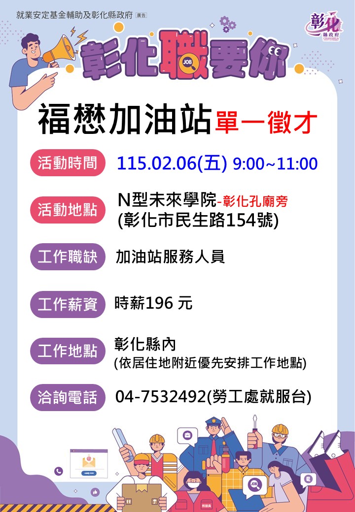 其他活動 🍀0206福懋加油站單一徵才活動🍀N型未來學院📣📣 發布日期 2026/01/22~2026/02/22 | 發佈單位: 勞工處就業服務科 | 發佈日期: 勞工處就服台 04-7532492 | 更新日期 2026/01/22 | 瀏覽人數: 29人 🏬0206福懋加油站單一徵才活動~ 🕘活動時間:115年2月6日(五)09:00-11:00🕚 📌活動地點:N型未來學院-彰化孔廟旁(彰化市民生路154號) 💼工作職缺:加油站服務人員 💰工作薪資:時薪196元 工作地點:彰化縣內(依居住地附近優先安排工作地點) 成立時間: 民國86年8月成立油品事業部。 公司簡介: 以「和諧、創新、服務、奉獻」及「顧客至上.質量保證.服務第一」的精神服務大眾。 福懋加油站自成立以來,正加緊速度 展站擴建,民國114年已完成105站。屆時可提供消費者更便利及親切加油服務。 📞洽詢電話:04-7532492(勞工處就服台)