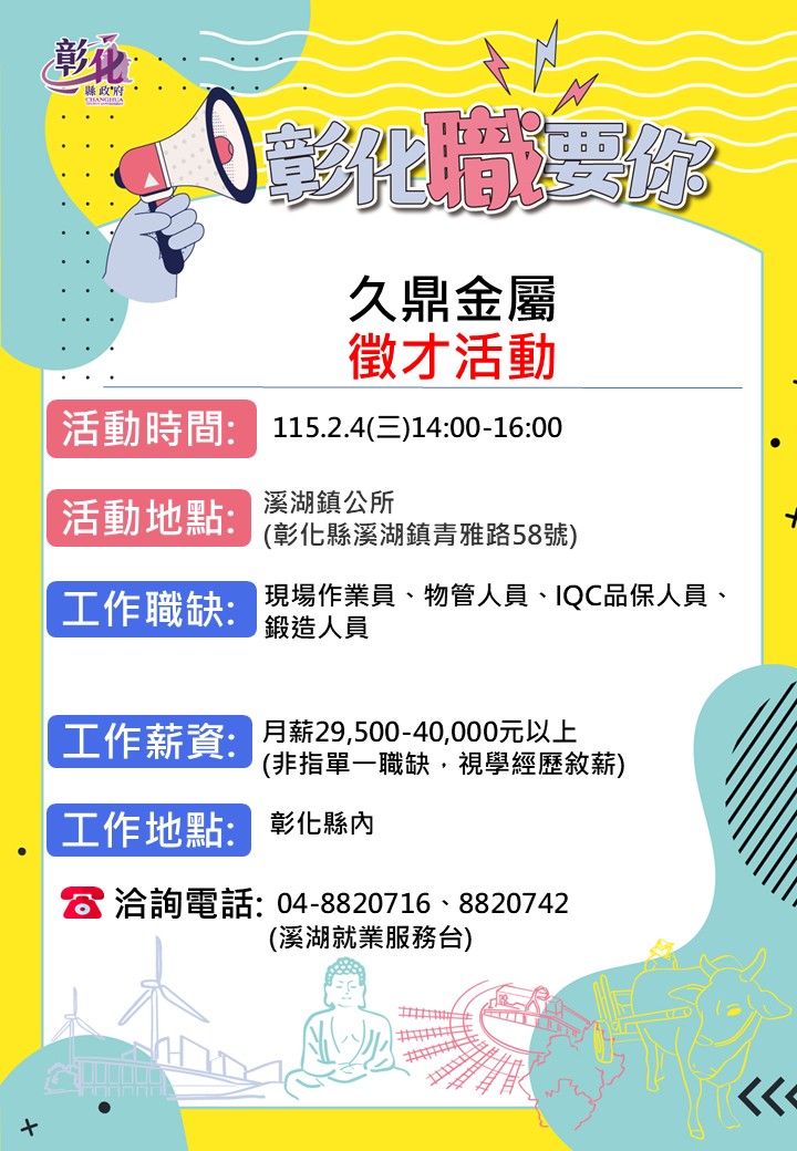 其他活動 🔥2/4久鼎金屬單一溪湖公所徵才活動🔥 發布日期 2026/01/28~2026/02/04 | 發佈單位: 勞工處就業服務科 | 發佈日期: 溪湖就業服務台 04-8820716 | 更新日期 2026/01/28 | 瀏覽人數: 9人 🔥2/4久鼎金屬單一溪湖公所徵才活動🔥 性 質:單一徵才活動 廠商名稱:久鼎金屬 ⏰時 間:115年2月4日(四)14:00-16:00 地 點:溪湖鎮公所一樓(彰化縣溪湖鎮青雅路58號) 職業名稱:現場作業員、物管人員、IQC品保人員、鍛造人員 薪 資:月薪29,500-40,000元以上 (依實際業務或工作執行情形核算) 工作地點: 彰化縣內 ☎️連絡電話:04-8820716 溪湖就服台