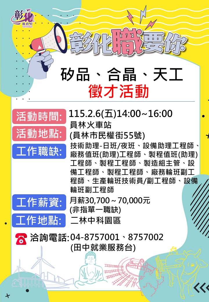 其他活動 2/6矽品、合晶、天工徵才活動 發布日期 2026/01/29~2026/02/06 | 發佈單位: 勞工處就業服務科 | 發佈日期: 田中就服台 04-8757002 | 更新日期 2026/01/29 | 瀏覽人數: 78人 2/6矽品&合晶&天工單一徵才(員林火車站) 性 質:廠商徵才活動 廠商名稱:矽品精密工業股份有限公司&合晶科技股份有限公司 &天工精密股份有限公司 ⌛️時 間:115/2/6(五)14:00-16:00 📌地 點:員林火車站(員林市民權街55號) 職業名稱: 1.矽品精密工業股份有限公司 技術助理-日班/夜班、設備助理工程師、廠務值班(助理)工程師、製程值班(助理)工程師、製程工程師、製造組主管 2.合晶科技股份有限公司 設備工程師、製程工程師、廠務輪班副工程師、生產輪班技術員/副工程師、設備輪班副工程師 3.天工精密股份有限公司 品管人員、機台操作員、助理工程師、電機維修人員 薪 資:月薪30,700~70,000元(非指單一職缺) 教育程度:高中職以上 工作地點:二林中科 ☎️連絡電話:04-8757001 04-8757002田中就服台