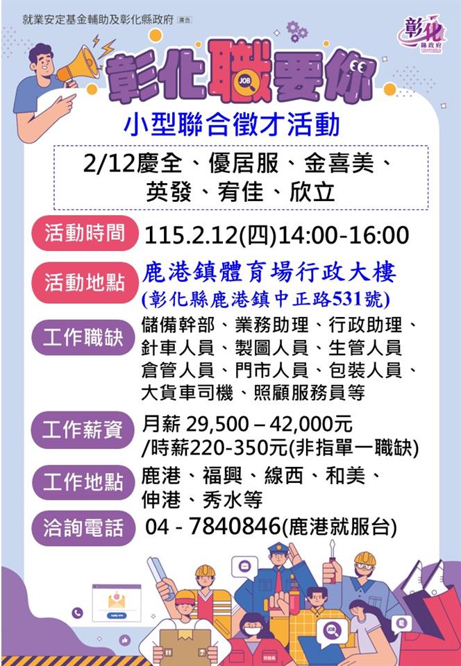 其他活動 📢2/12鹿港體育場小型徵才 發布日期 2026/01/29~2026/02/12 | 發佈單位: 勞工處就業服務科 | 發佈日期: 陳小姐/張小姐 04-7840846 | 更新日期 2026/01/29 | 瀏覽人數: 47人 《置頂》 性 質:2/12鹿港體育場小型徵才活動 徵才廠商:慶全、優居服、金喜美、英發、宥佳、欣立 活動時間:115年2月12日(星期四) 14:00-16:00 活動地點:彰化縣鹿港鎮中正路531號(鹿港體育場行政大樓) 活動職缺: 1.慶全(福興):倉管、工務專員、包裝人員、現場作業員、大貨車司機 2.優居服(線西):照顧服務員(彰化縣各鄉鎮) 3.金喜美(福興):賣場營業人員、肉品人員、生鮮包裝、生鮮助理、倉管人員 4.英發(福興):生產儲備幹部、生管人員、工業設計師、模具主管、製圖人員 5.宥佳(伸港):居家照顧服務員(和美、線西、伸港、鹿港等) 6.欣立(福興):行政助理、業務助理、針車人員 雇用人數:72人 教育程度:不拘 工作地點:鹿港、福興、線西、和美、伸港 薪 資:月薪 30,000~42,000元/時薪220~350元