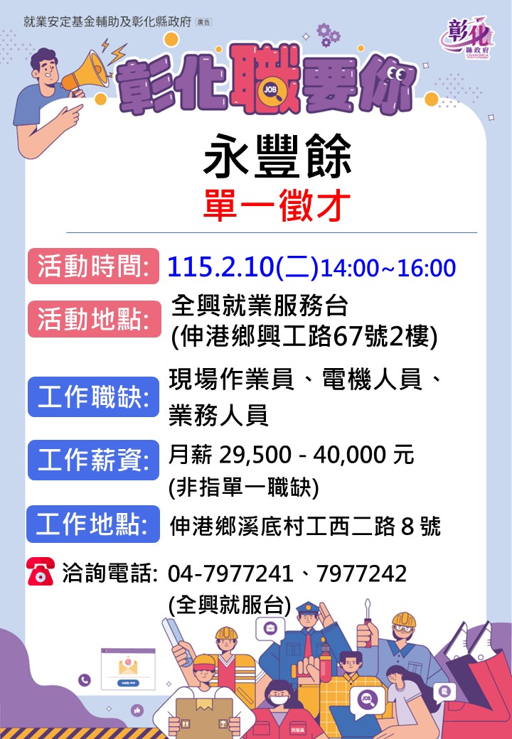 其他活動 2/10永豐餘實業單一徵才 發布日期 2026/01/30~2026/02/10 | 發佈單位: 勞工處就業服務科 | 發佈日期: 王麗娟 04-7977241 | 更新日期 2026/01/30 | 瀏覽人數: 55人 廠商名稱:永豐餘造紙股份有限公司 時 間:115年2月10日(二) 14:00-16:00 地 點:全興就業服務台(伸港鄉興工路67號2樓) 職業名稱:現場作業員、電機人員、業務人員(可年後上班) 工作薪資:月薪29,500元-40,000元以上(非指單一職缺) 工作地點:伸港鄉 洽詢電話:04-7977241