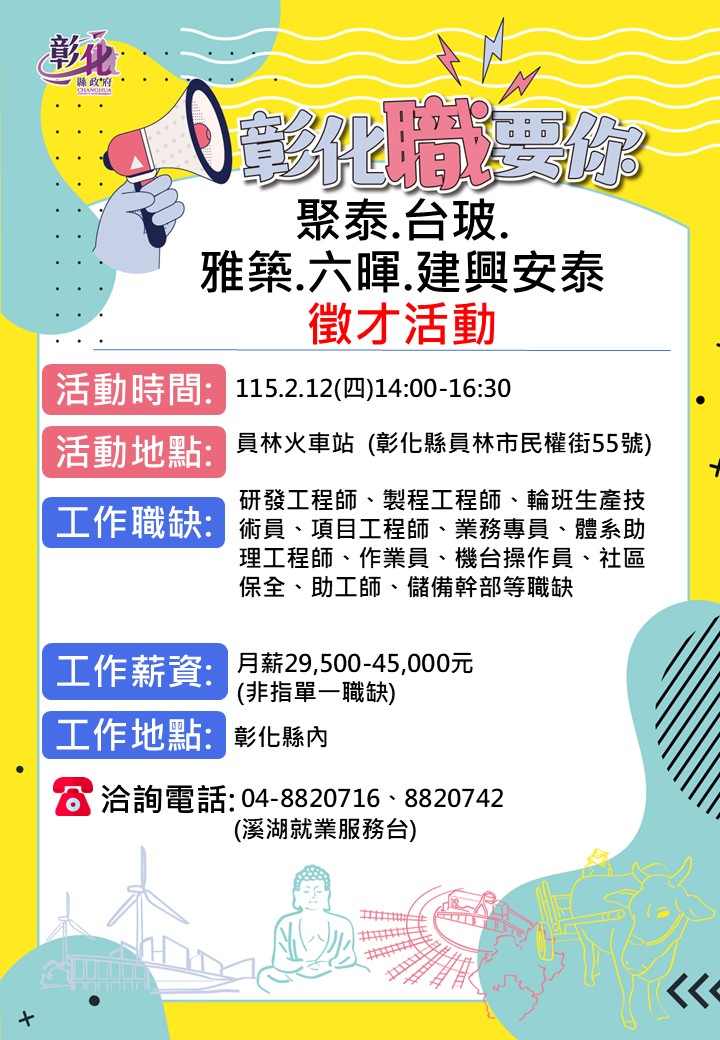 其他活動 🔥2/12 員林火車站小型徵才活動🔥 發布日期 2026/02/06~2026/02/12 | 發佈單位: 勞工處就業服務科 | 發佈日期: 溪湖就業服務台 04-8820716 | 更新日期 2026/02/06 | 瀏覽人數: 143人 🔥2/12 員林火車站小型徵才活動🔥 性 質:小型徵才活動 廠商名稱:聚泰、台玻、雅築保全、六暉、建興安泰 ⏰時 間:115年2月12日(四)14:00-16:30 地 點:員林火車站一樓 (彰化縣員林市民權路55號) 職業名稱:研發工程師、製程工程師、輪班生產技術員、項目工程師、業務專 員、體系助理工程師、作業員、機台操作員、社區保全、助工師、 儲備幹部等職缺 薪 資:月薪29,500-45,000元(非指單一職缺) 工作地點:彰化縣內 ☎️連絡電話:04-8820716、8820742 溪湖就服台
