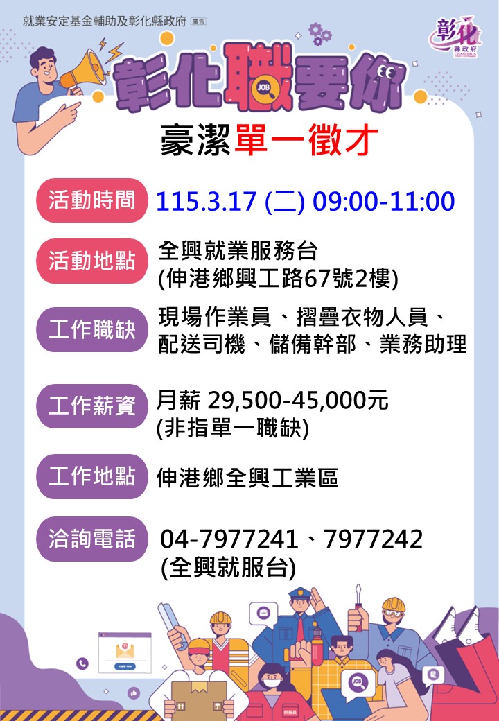 其他活動 ☘️ ☘️年後轉職~ 3/17豪潔單一徵才 發布日期 2026/02/09~2026/03/17 | 發佈單位: 勞工處就業服務科 | 發佈日期: 林小姐 7977242 | 更新日期 2026/02/09 | 瀏覽人數: 82人 ☘️ ☘️年後轉職~ 3/17豪潔單一徵才 性 質:廠商單一徵才活動 廠商名稱:豪潔實業股份有限公司 時 間:115年3月17日(二) 上午09:00-11:00 地 點:全興就業服務台(伸港興工路67號2樓/全興產業園區服務中心) 職業名稱:現場作業員、業務助理、配送司機、摺疊衣物人員/布服整理、儲備幹部 薪 資:月薪29,500元 ~45,000元(非指單一職缺) 教育程度:不拘 工作地點:彰化縣伸港鄉 歡迎應徵~ 🙋 🙋 🙋 連絡電話:04-7977241、7977242全興就服台 ◎豪潔公司簡介:我們重視每一位員工,除了有良好工作環境、也提供學習及成長的空間,歡迎優秀的朋友一起加入豪潔實業股份有限公司的工作行列。 ◎豪潔公司福利制度:1獎金-三節禮金、推薦優秀人才獎金、在職員工及子女獎學金、生日禮金、專案加給 2.補助-結婚補助、住院及喪葬慰問金 3.同仁制服 4.員工聚餐5.尾牙 6.在職訓練 7.免費健康檢查