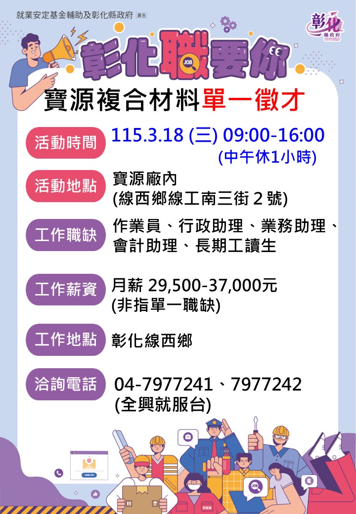 其他活動 🌺3/18寶源複合材料徵才 發布日期 2026/02/10~2026/03/10 | 發佈單位: 勞工處就業服務科 | 發佈日期: 林小姐 7568509 | 更新日期 2026/02/10 | 瀏覽人數: 17人 🌺3/18寶源複合材料徵才 性 質:廠商單一徵才活動 廠商名稱:寶源複合材料股份有限公司 時 間:115年3月18日(三)9:00-16:00(中午休息1小時) 地 點:廠內(線西鄉彰濱工業區線工南三街2號) 職業名稱:行政助理、會計助理、業務助理、長期工讀生、現場作業員 薪 資:月薪29,500元 ~37,000元(非指單一職缺) 教育程度:國中、高中 工作地點:彰化縣線西鄉 年底找個好工作,歡迎應徵~ 🙋 🙋 🙋 連絡電話:04-7977241、7977242全興就服台 ◎寶源複合材料公司簡介:致力於橡膠黏鐵技術之研發。主要產品為橡膠黏鐵華司,及迫緊各類橡膠製品,並提供橡膠製品客製化服務。 ◎寶源複合材料福利制度: 年終、三節禮金、員工旅遊、尾牙、慶生會、產能獎金