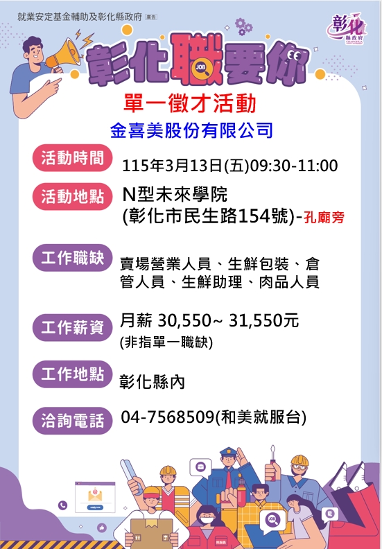 其他活動 🔔115/3/13喜美超市單一徵才活動 發布日期 2026/03/02~2026/03/13 | 發佈單位: 勞工處就業服務科 | 發佈日期: 和美就服台 04-7568509 | 更新日期 2026/03/02 | 瀏覽人數: 36人 🔸廠商名稱:金喜美股份有限公司 🔸時 間:115年3月13日(五) 09:30-11:00 🔸地 點:N型未來學院(彰化市民生路154號-彰化孔廟旁) 🔸職業名稱:賣場營業人員、生鮮包裝、倉管人員、生鮮助理、肉品人員 🔸薪 資:月薪30,550元~31,550元(非指單一職缺) 🔸工作地點:彰化縣內各門市 🔸營業項目:超級市場業務經營及農產品、日用品雜貨、冷凍食品等買賣。 🔸公司簡介: 金喜美股份有限公司-喜美超市-36家直營超級市場,成立於民國81年12月25日,至今有36家門市及實力堅強的管理總部。 🔸福利制度: 年終獎金、績效獎金、員工健檢、員工聚餐、員工制服、員工旅遊、春酒、婚喪喜慶補助金、員購福利、員工健康檢查、教育訓練、良好升遷制度...等。 🔸聯絡電話:04-7568509和美就服台