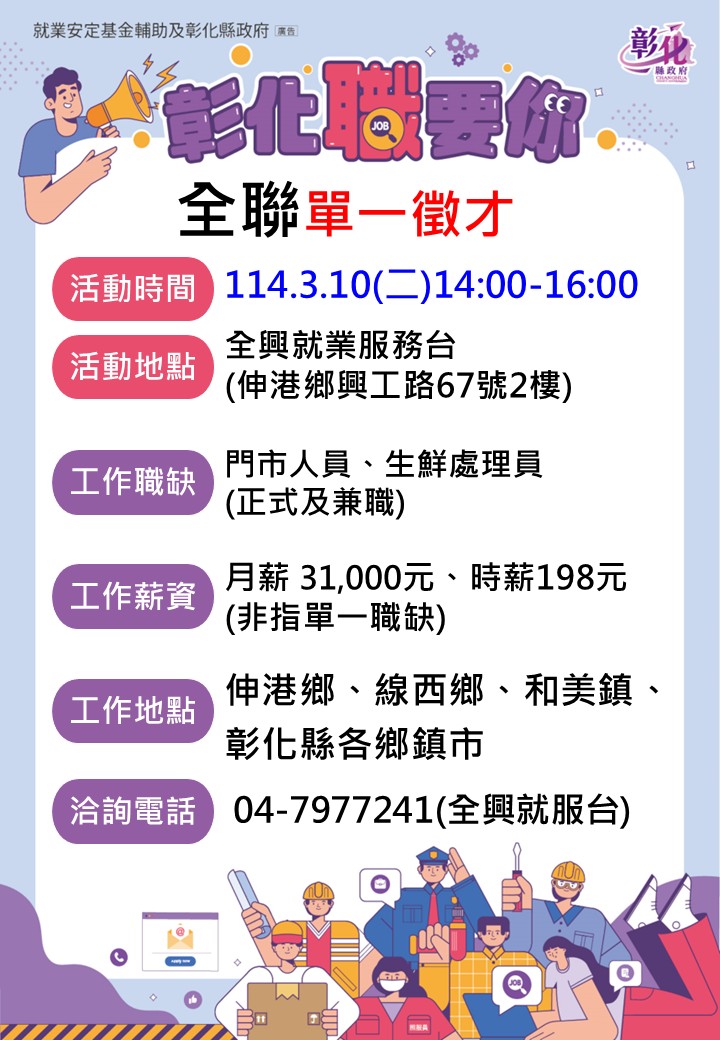 其他活動 0310全聯單一徵才活動 發布日期 2026/03/03~2026/03/10 | 發佈單位: 勞工處就業服務科 | 發佈日期: 王麗娟 7977241 | 更新日期 2026/03/03 | 瀏覽人數: 13人 0310全聯單一徵才活動~ 活動時間:115年3月10日(二)14:00~16:00 活動地點:全興就業服務台(伸港鄉興工路67號2樓) 工作職缺:正職門市人員、 兼職門市人員 工作薪資:月薪31,000元/時薪198元(非指單一職缺) 工作地點:彰化縣內(依居住地附近優先安排工作地點) 公司簡介: 1998年,全聯福利中心成立,從原有的66家賣場持續成長,至今全台已超過1000家,成為台灣主要零售通路之一。 2008年,全聯跨足生鮮產業,選擇從產地源頭開始管理,為食品安全把關,成為全台灣最大現代化農產品銷售通路。 一路走來,全聯扮演著「全民超市」的角色,從熱鬧的都會區到偏僻鄉村離島,都有全聯身影。 期待您的加入,成就更多人的美好生活! 📞洽詢電話:04-7977241(全興就服台)