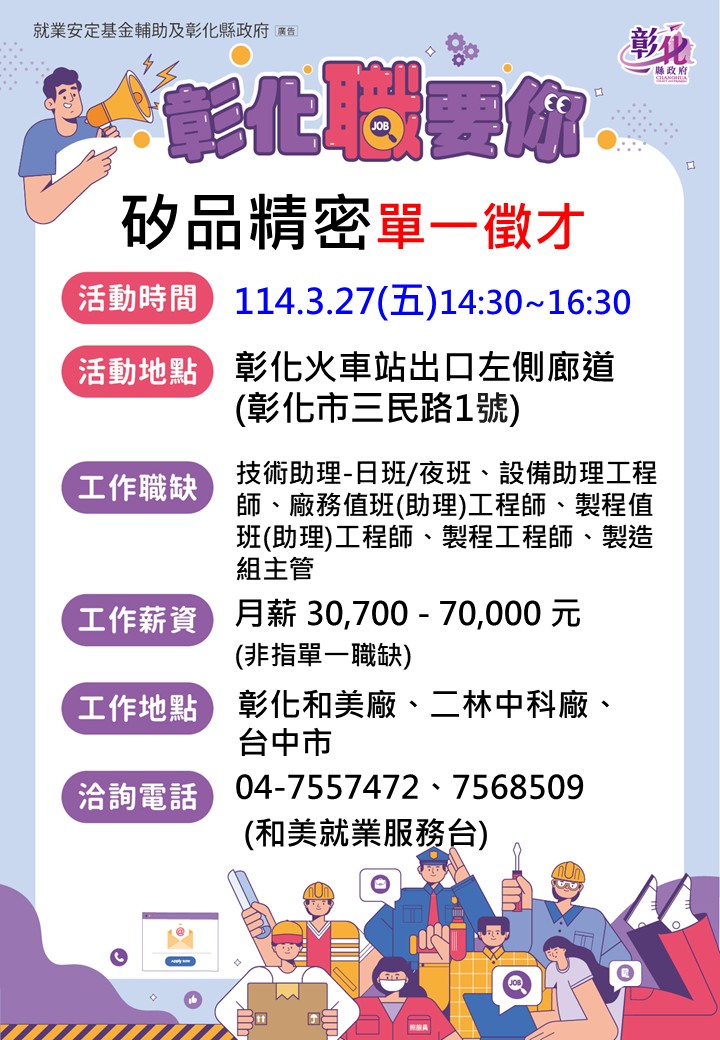 其他活動 🎯3/27矽品精密單一徵才 (彰化火車站) ~年後轉職敬請把握 發布日期 2026/03/04~2026/04/04 | 發佈單位: 勞工處就業服務科 | 發佈日期: 林小姐 7977242 | 更新日期 2026/03/04 | 瀏覽人數: 49人 🎉🎉3/27矽品精密單一徵才 (彰化火車站) 3/27矽品精密單一徵才 (彰化火車站) 性 質:廠商單一徵才活動 廠商名稱:矽品精密工業股份有限公司 時 間:115年3月27日(五) 14:30-16:30 地 點:彰化火車站出口左側廊道(彰化市三民路1號) 職業名稱:技術助理-日班/夜班、設備助理工程師、廠務值班(助理)工程師、製程值班(助理)工程師、製程工程師、製造組主管 薪 資:月薪 30,700 - 70,000 元(非指單一職缺) 教育程度:高中職以上 工作地點:彰化和美廠、二林中科廠 、台中市 連絡電話: 04-7977242全興就服台 公司簡介: 矽品公司成立於民國73年,主要提供各項積體電路封裝及測試之服務。產品包含先進的導線架類及基板類封裝體,廣泛應用於電腦、平板電腦、手機、機上盒、液晶顯示器、穿戴式裝置、智慧家電、人工智慧、無人機、語音助理、物聯網、指紋辨識器、智能汽車、虛擬實境/擴增實境、數位相機及遊戲機等產品。 公司福利制度: 1.三節獎金、季績效獎金依公司獲利發放。 2.每年提撥10%可分配盈餘,經營成果全員共享。 3.生產獎金:每月依營收達成狀況及個人績效表現發放,資深員工獎勵金。 4.育兒津貼每名補助5,000元/月。 5.餐費補助及豐富多樣員工餐。 6.設施-廠內設有便利商店。 7.提供四星級宿舍、健身房、KTV、才藝教室等。 8.備有交通車接送上下班。 9.各項補助、各式票券禮卷等。 10.社團活動、定期員工健檢、廠商駐廠服務、旅行規劃活動等安排。
