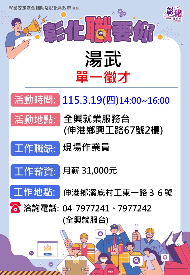 其他活動 03/19湯武單一徵才 發布日期 2026/03/05~2026/03/19 | 發佈單位: 勞工處就業服務科 | 發佈日期: 王麗娟 7977241 | 更新日期 2026/03/05 | 瀏覽人數: 34人 03/19湯武單一徵才 廠商名稱:湯武生技企業有限公司 時 間:115年3月19日(三) 14:00-16:00 地 點:全興就業服務台(伸港鄉興工路67號2樓) 職業名稱:現場作業員 工作內容:無經驗可 工作薪資:月薪31,000元 雇用人數:5人 教育程度:不拘 洽詢電話:04-7977241