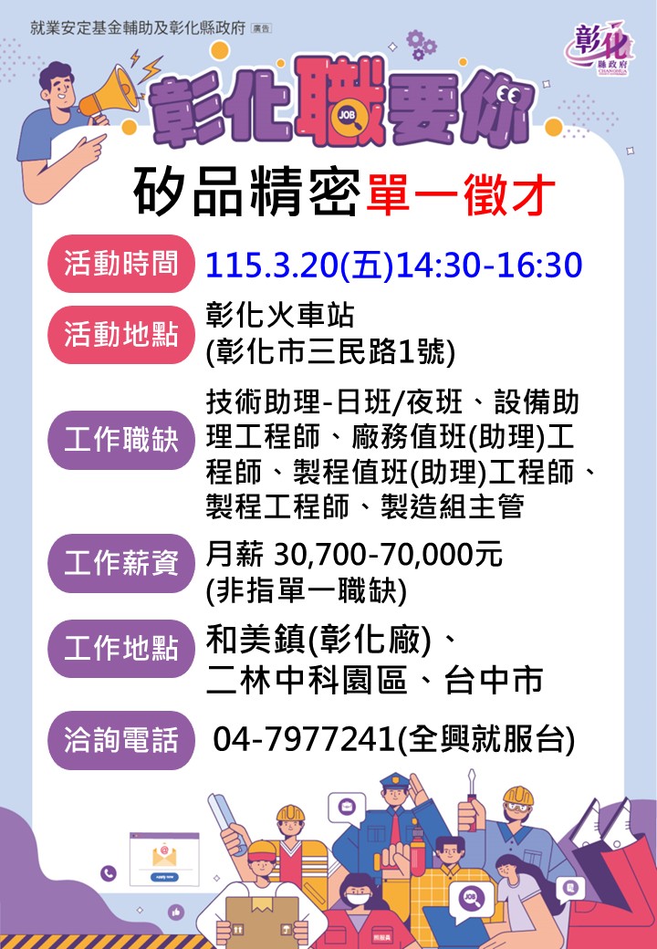 其他活動 3/20矽品精密單一徵才 (彰化火車站) 發布日期 2026/03/05~2026/03/20 | 發佈單位: 勞工處就業服務科 | 發佈日期: 王麗娟 7977241 | 更新日期 2026/03/05 | 瀏覽人數: 29人 3/20矽品精密單一徵才 (彰化火車站) 性 質:廠商單一徵才活動 廠商名稱:矽品精密工業股份有限公司 時 間:115年3月20日(五) 14:30-16:30 地 點:彰化火車站出口左側廊道(彰化市三民路1號) 職業名稱:技術助理-日班/夜班、設備助理工程師、廠務值班(助理)工程師、製程值班(助理)工程師、製程工程師、製造組主管 薪 資:月薪 30,700 - 70,000 元(非指單一職缺) 教育程度:高中職以上 工作地點:彰化和美廠、二林中科廠 、台中市 連絡電話: 04-7977241全興就服台 公司簡介: 矽品公司成立於民國73年,主要提供各項積體電路封裝及測試之服務。產品包含先進的導線架類及基板類封裝體,廣泛應用於電腦、平板電腦、手機、機上盒、液晶顯示器、穿戴式裝置、智慧家電、人工智慧、無人機、語音助理、物聯網、指紋辨識器、智能汽車、虛擬實境/擴增實境、數位相機及遊戲機等產品。 公司福利制度: 1.三節獎金、季績效獎金依公司獲利發放。 2.每年提撥10%可分配盈餘,經營成果全員共享。 3.生產獎金:每月依營收達成狀況及個人績效表現發放,資深員工獎勵金。 4.育兒津貼每名補助5,000元/月。 5.餐費補助及豐富多樣員工餐。 6.設施-廠內設有便利商店。 7.提供四星級宿舍、健身房、KTV、才藝教室等。 8.備有交通車接送上下班。 9.各項補助、各式票券禮卷等。 10.社團活動、定期員工健檢、廠商駐廠服務、旅行規劃活動等安排。