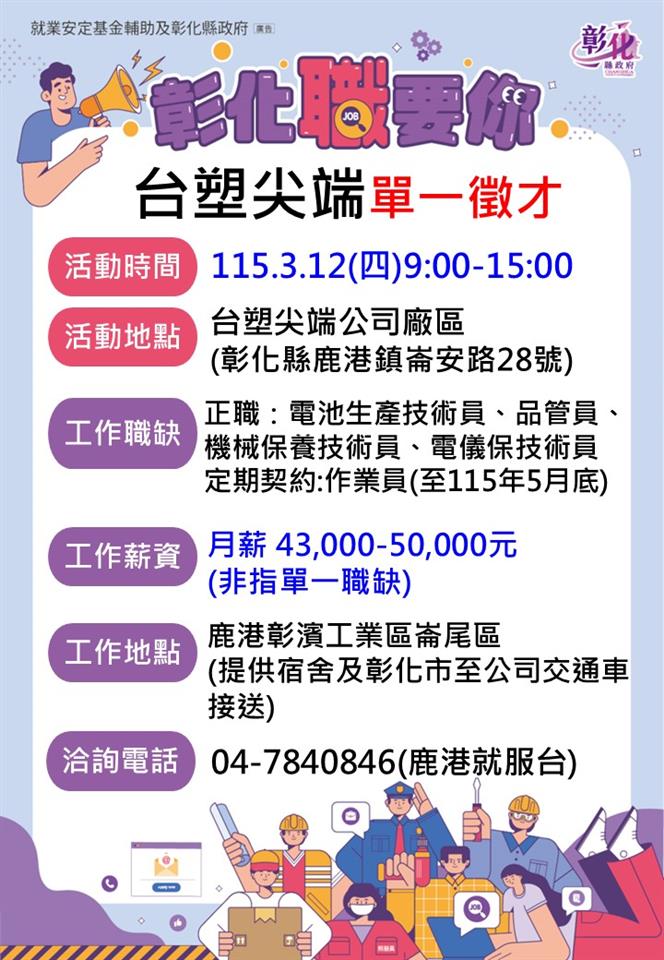 其他活動 📢3/12台塑尖端單一徵才(正職+契約工) 發布日期 2026/03/07~2026/03/12 | 發佈單位: 勞工處就業服務科 | 發佈日期: 陳小姐/張小姐 04-7840846 | 更新日期 2026/03/06 | 瀏覽人數: 9人 《置頂》 性 質:單一廠商徵才活動 廠商名稱:(台塑企業)台塑尖端能源科技股份有限公司 活動時間:115年3月12日(星期四) 9:00 ~ 15:00 活動地點:台塑尖端公司廠區【彰化縣鹿港鎮崙安路28號】 職業名稱:1.正職:生產技術技術員、品管員、機械保養技術員、電儀保技術員(薪資43,000-47,000元-非指單一職缺) 2.定期契約:43,000-50,000元(可固定班)- 至115年5月底止(表現良好可升正職) 公司簡介:台塑新智能2023年透過子公司「台灣尖端能源」在彰濱工業區投資上百億元,建造全台灣規模最大的5GWh鋰鐵電芯及模組廠,為電動車及儲能系統提供安全、穩定的鋰鐵電芯,打造完整的國產電池產業鏈,開啟台灣新能源產業的新紀元。 福利制度: 年資每滿五年贈1枚24K紀念金幣、每年固定調薪制度、高於業界水準的年終及三節獎金、員工及眷屬至長庚醫院就醫補助、免費健檢、保健諮詢服務、電動機車換購補助1.6萬元、新購補助1萬元、生日禮物券、三節福利券、春秋兩季員工郊遊、踏青補助、歲末年終歡樂聚餐、0到6歲每月2千元育兒補助、懷孕福袋、寶寶禮品及禮金、子女教育獎學金 工作內容:電池製造業 雇用人數:共53人 教育程度:不拘 交通能力:1.自行前往2.提供宿舍3.彰化市至公司交通車接送 工作地點:鹿港彰濱工業區崙尾區 工作時間:輪班(四班三輪)、三班(固定班) 僱用期限:長期性 洽詢電話:04-7840846(鹿港就服台)