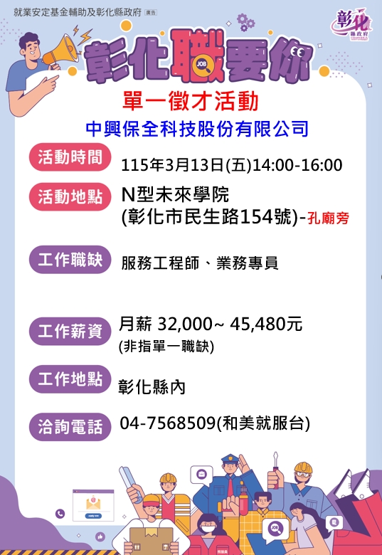 其他活動 📢📢0313中興保全單一徵才活動~~N型未來學院👮 發布日期 2026/03/09~2026/03/13 | 發佈單位: 勞工處就業服務科 | 發佈日期: 和美就服台 04-7568509 | 更新日期 2026/03/09 | 瀏覽人數: 49人 廠商名稱:中興保全科技股份有限公司👮 ☎️活動時間:115年3月13日(五)14:00-16:00⏰ 📌活動地點:N型未來學院-彰化孔廟旁(彰化市民生路154號) 職業名稱:服務工程師、業務專員 🎁薪 資:月薪 32,000-45,480 元 (非指單一職缺) 工作地點:彰化縣內 🎀公司簡介🎀 中興保全科技股份有限公司為中保科技集團的主要成員之ㄧ,以結合科技應用的「中保無限+」服務體系,做為物聯網實踐者。在安全服務之外,增加服務的方便性與趣味性。 🪭福利制度🪭 1.獎助學金2.紅利3.三節獎金4.團險5.社團6.完整的教育訓練7.健檢 📞洽詢電話:04-7568509(和美就服台)